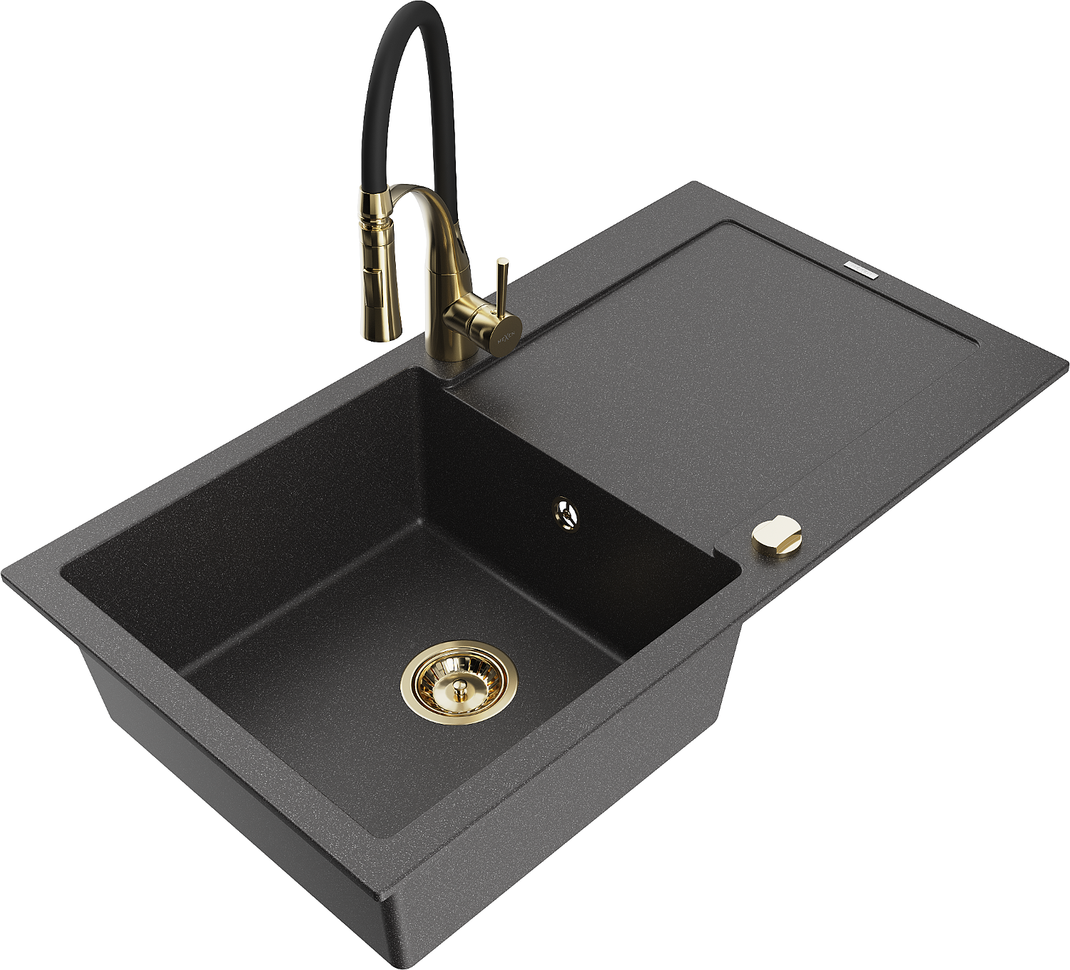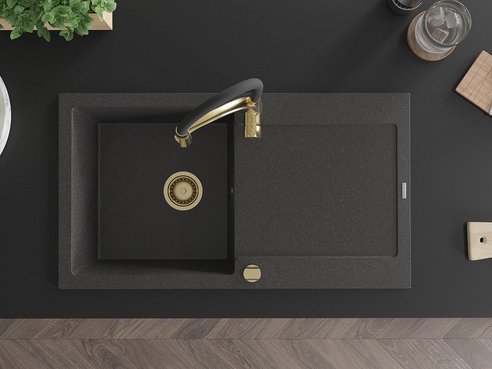 Mexen Leo jedno-komorový žulový dřez s odkapávačem a kuchyňskou baterií Aster, černý melírovaný - 6501-76-73450-57-G