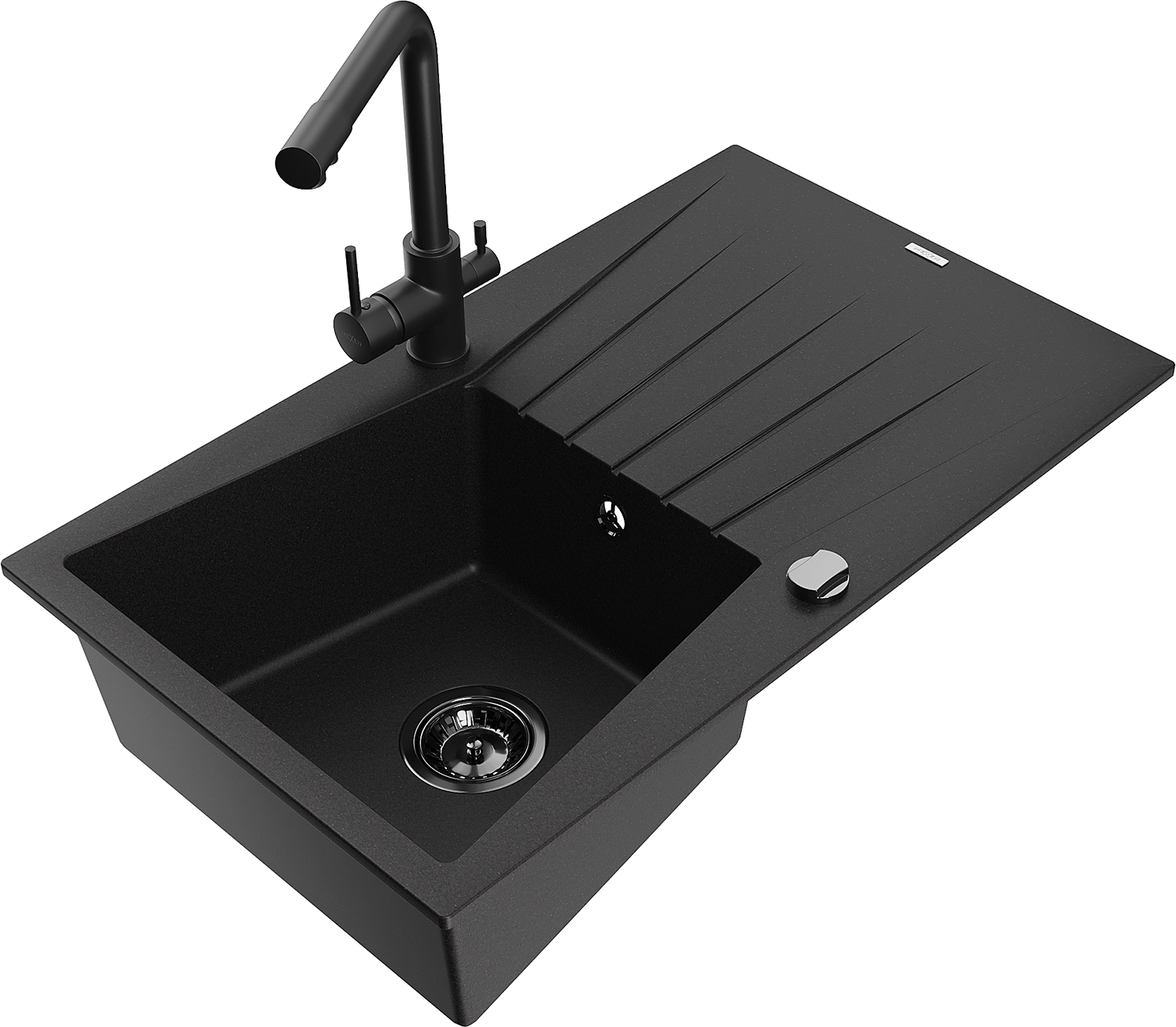 Mexen Cesar granitový dřez 1-komorový s odkapávačem a kuchyňskou baterií Duero, černý - 6514-77-671600-70-B