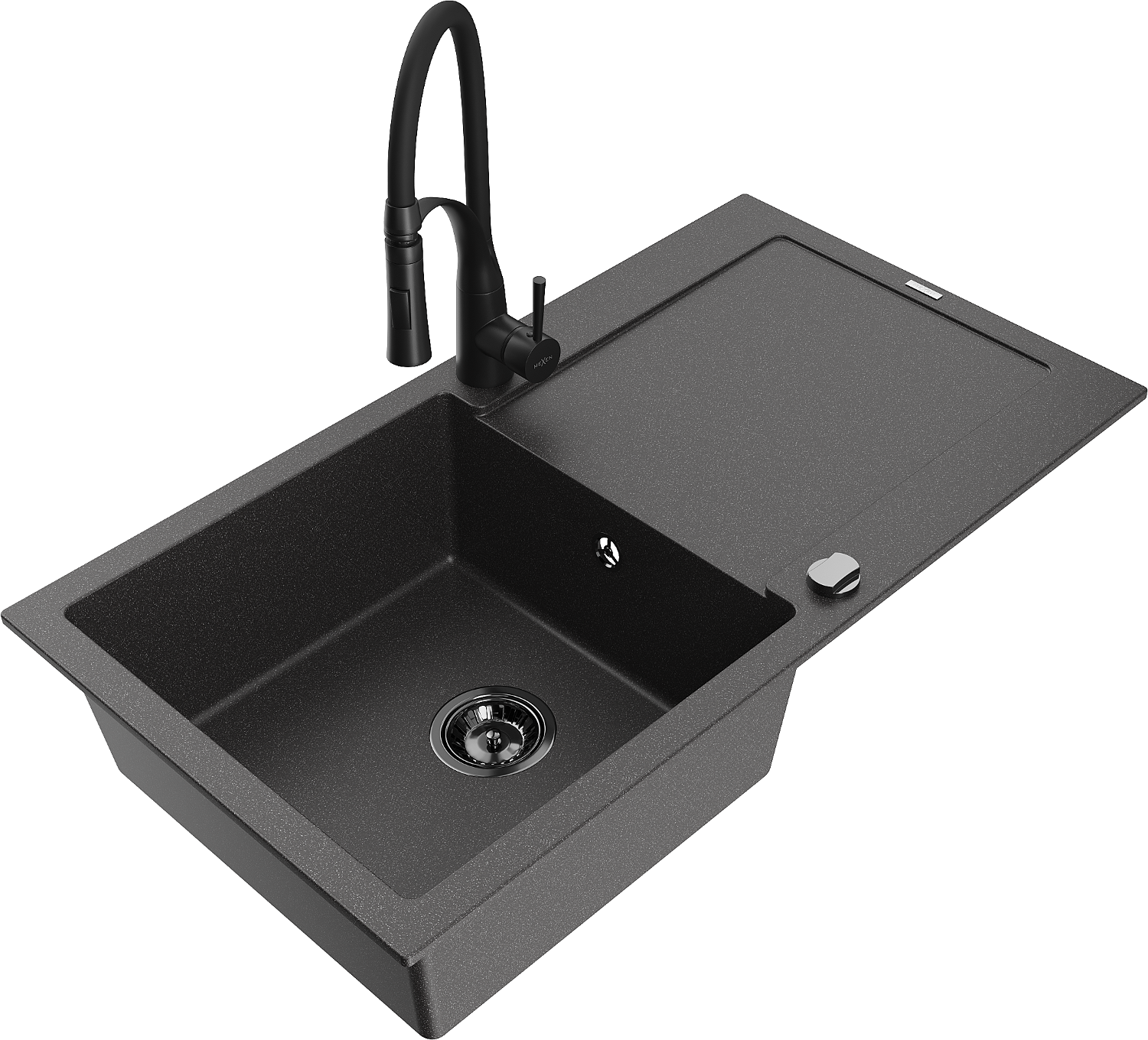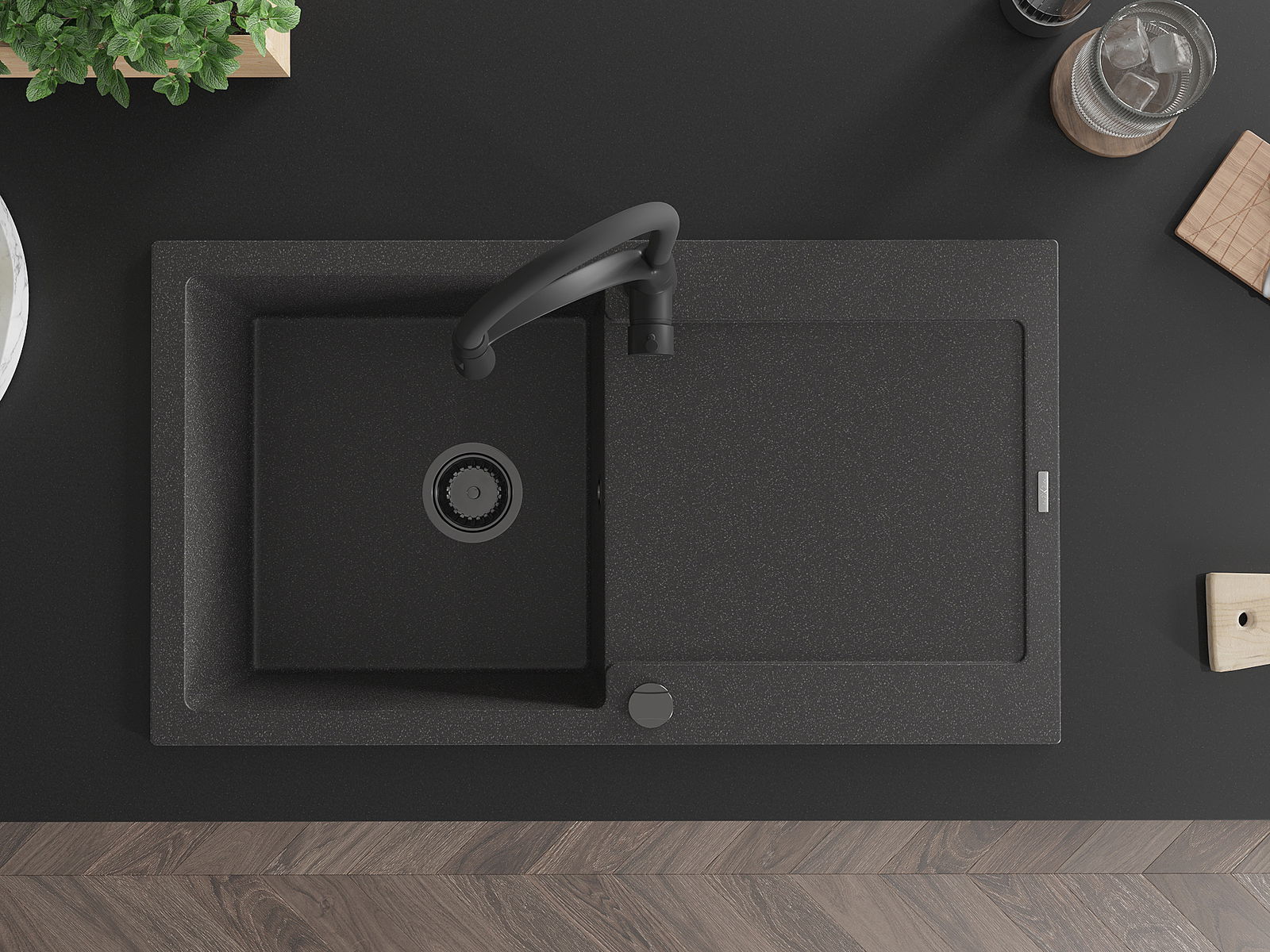 Mexen Leo granitový dřez s 1 komorou, odkapávačem a kuchyňskou baterií Aster, černý skvrnitý - 6501-76-73450-70-B