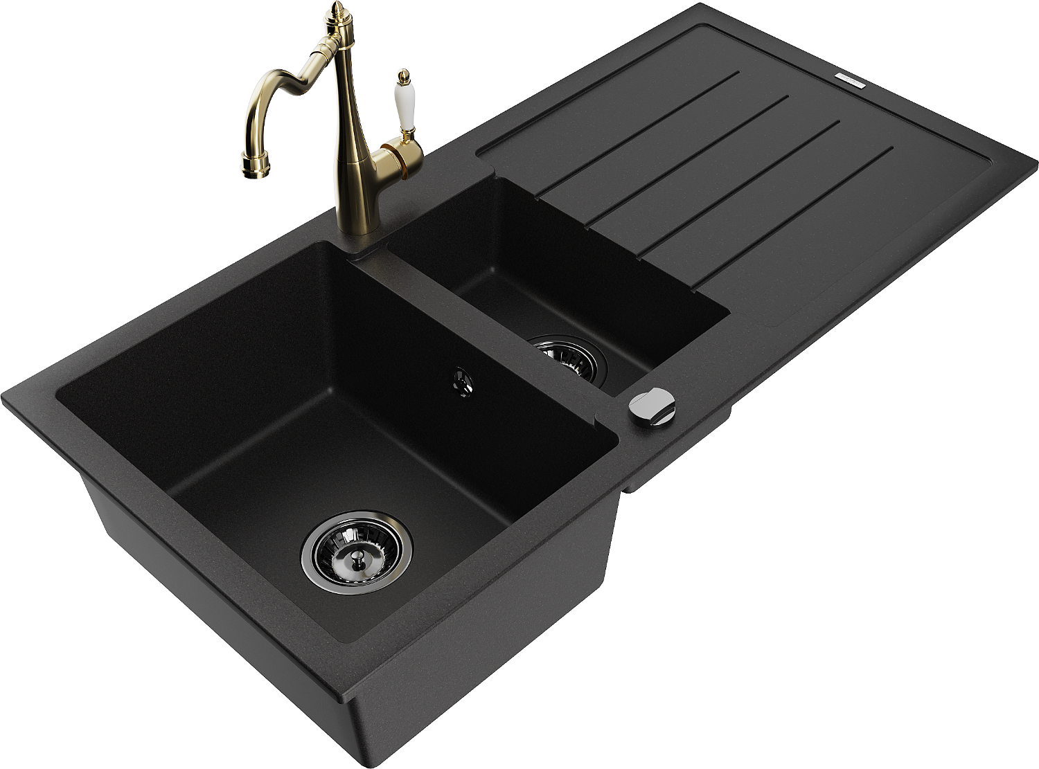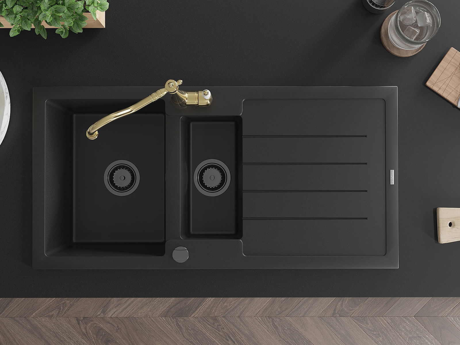 Mexen Andres granitový dřez 1,5-komorový s odkapávačem a kuchyňskou baterií Carla, černý - 6515-77-670700-50-B