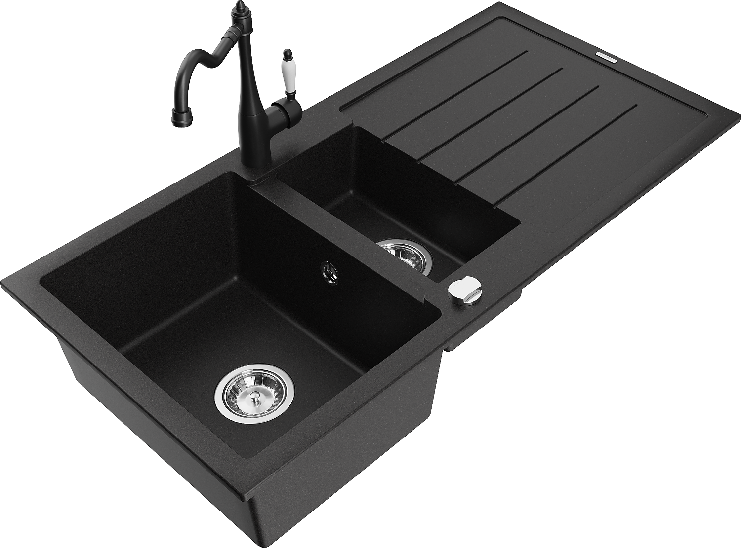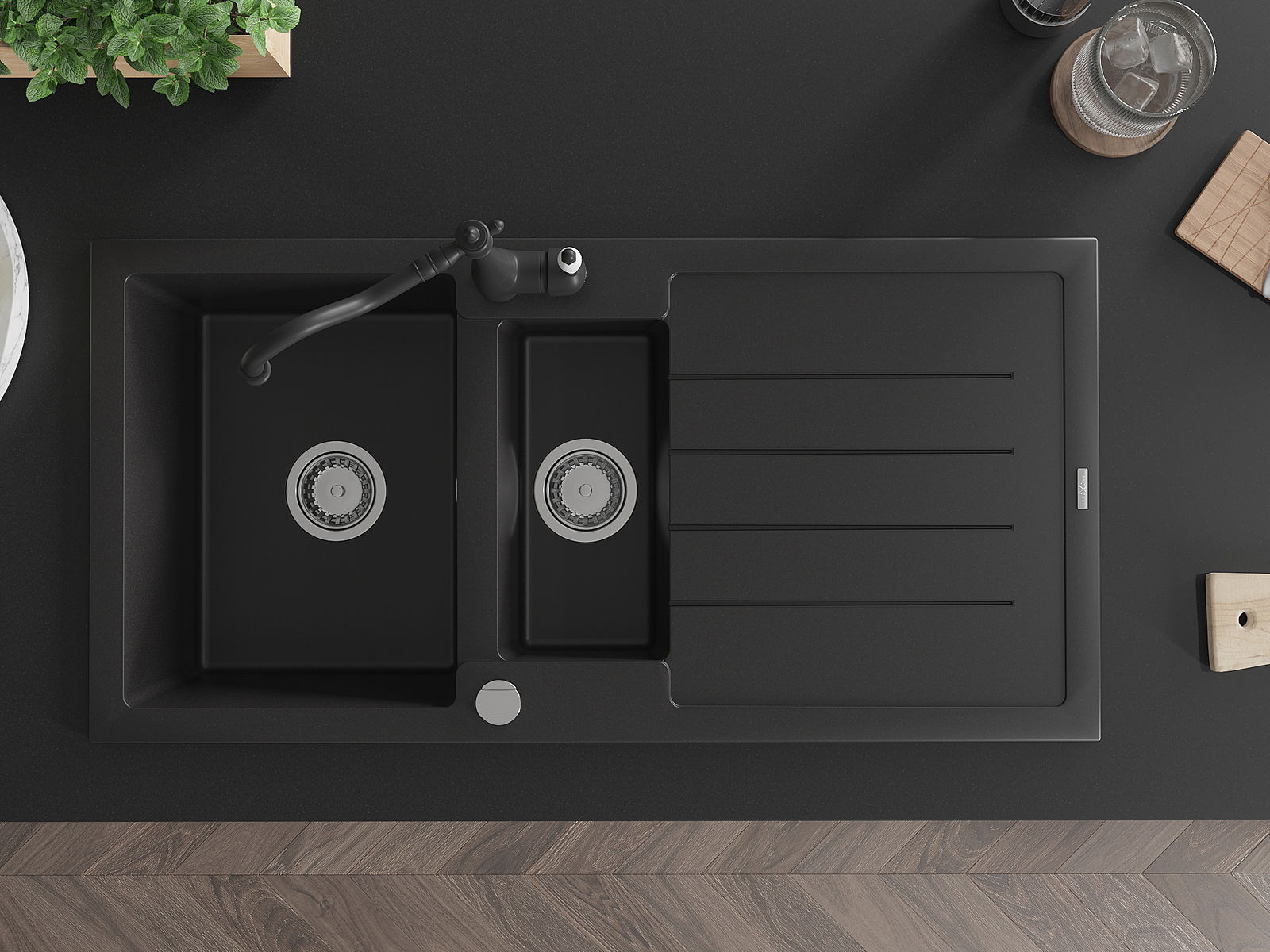 Mexen Andres granitový dřez 1,5-komorový s odkapávačem a kuchyňskou baterií Carla, černý - 6515-77-670700-70
