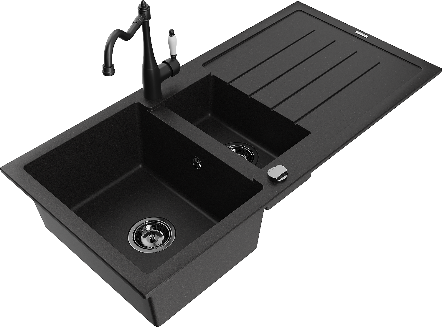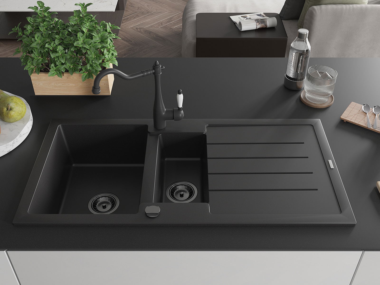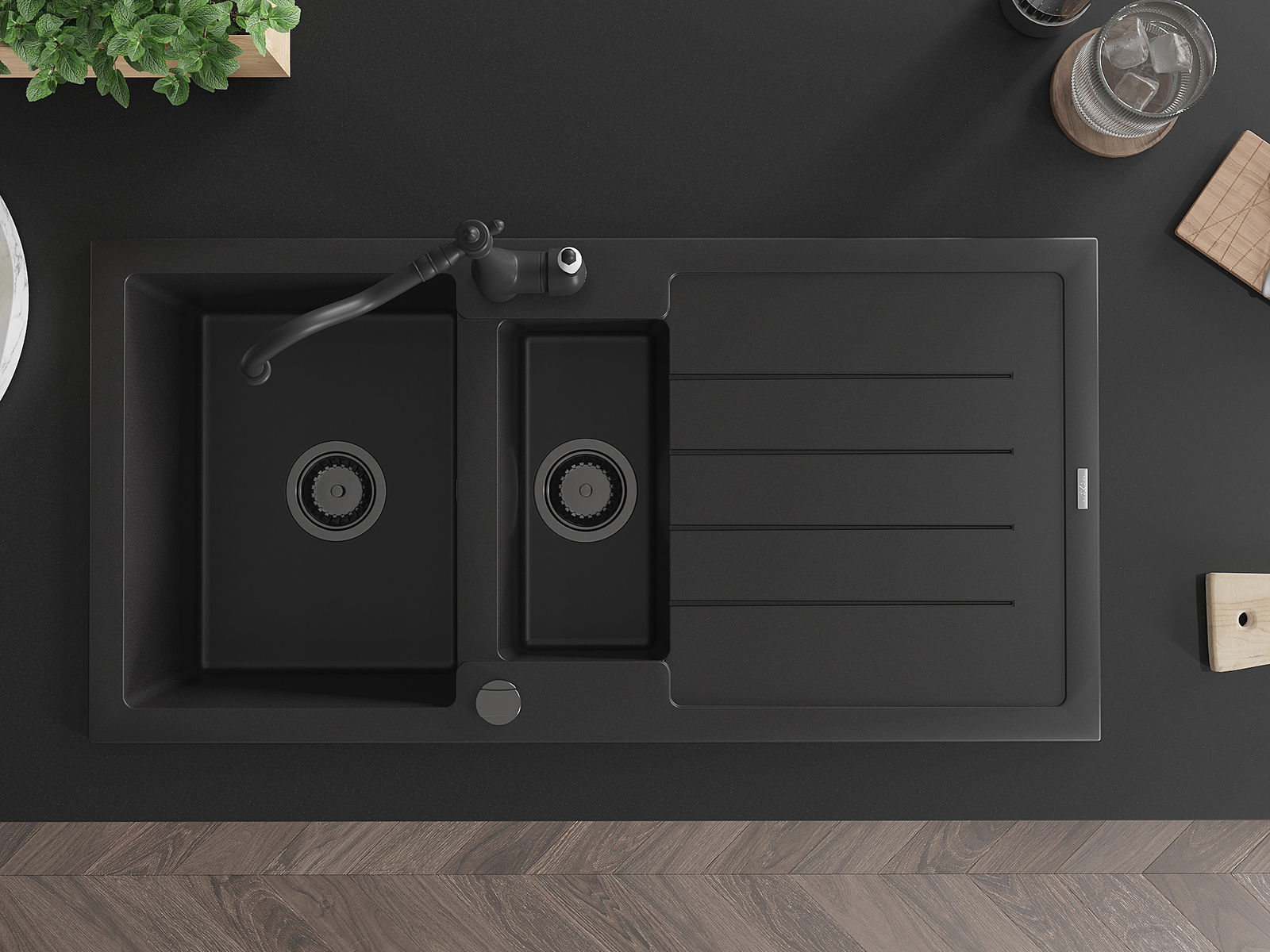 Mexen Andres granitový dřez 1,5-komorový s odkapávačem a kuchyňskou baterií Carla, černý - 6515-77-670700-70-B