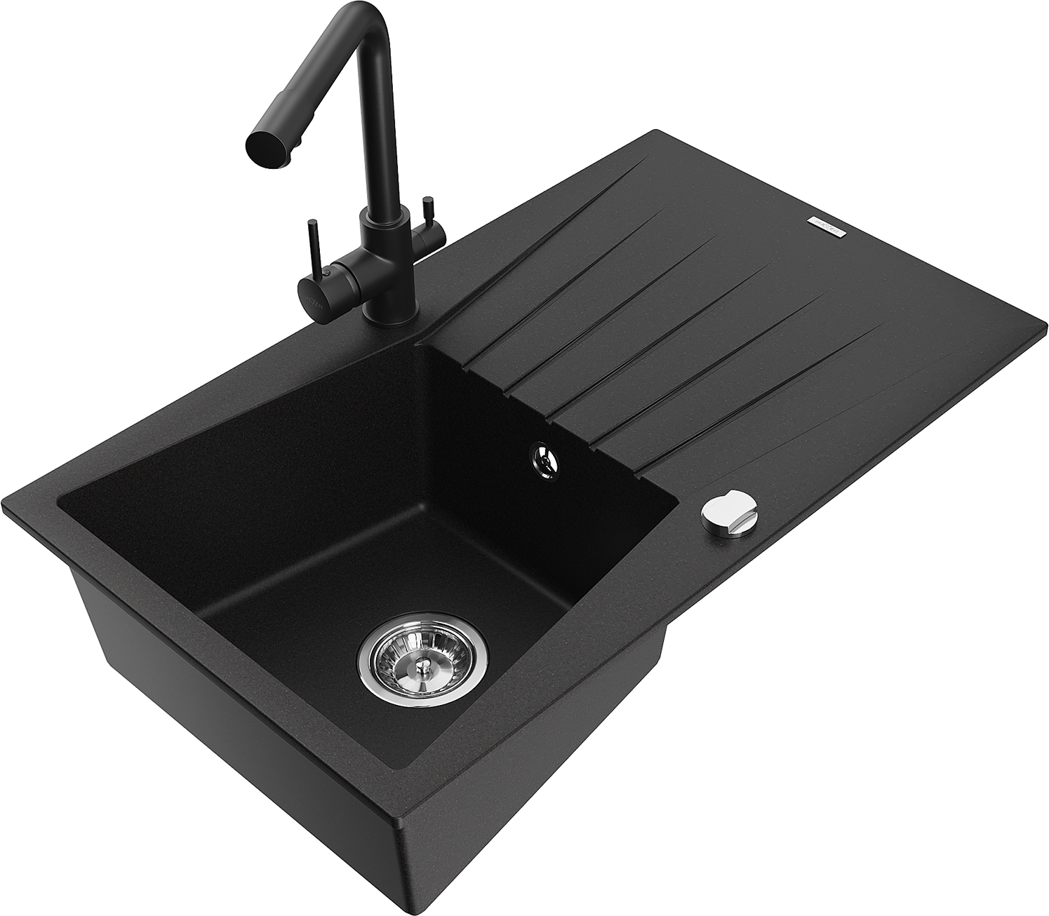 Mexen Cesar granitový dřez 1-komorový s odkapávačem a kuchyňskou baterií Duero, černý - 6514-77-671600-70