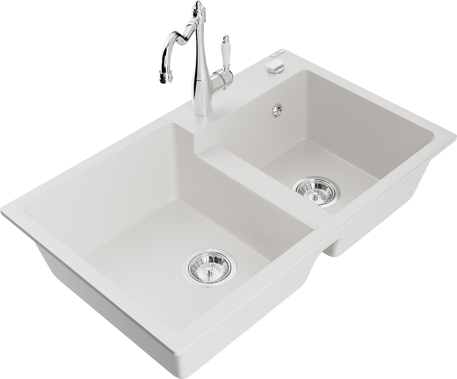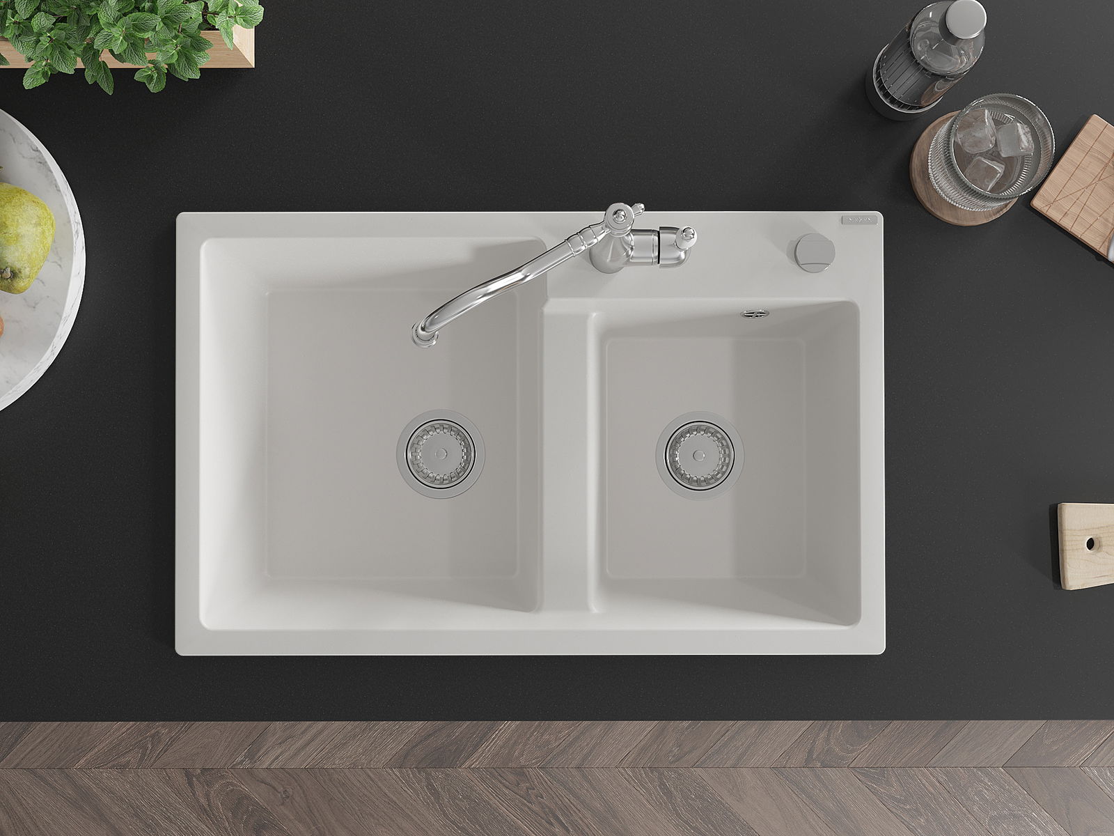 Mexen Tomas 2-komorový granitový dřez s kuchyňskou baterií Carla, bílý - 6516-20-670700-00