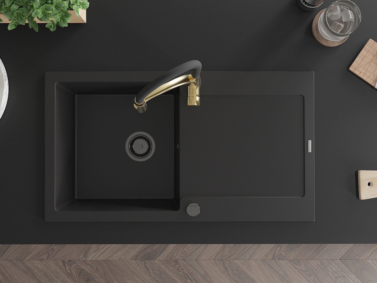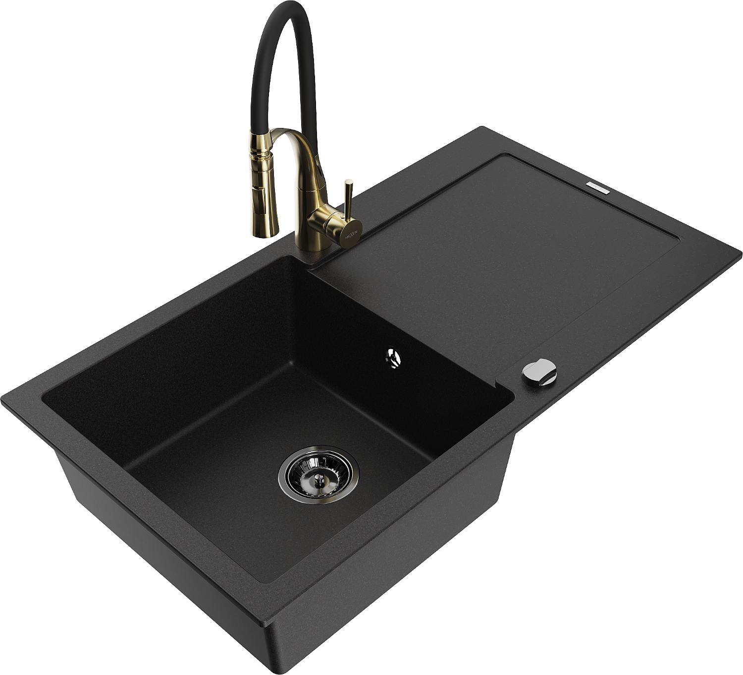 Mexen Leo granitový dřez 1-komorový s odkapávačem a kuchyňskou baterií Aster, černý - 6501-77-73450-57-B