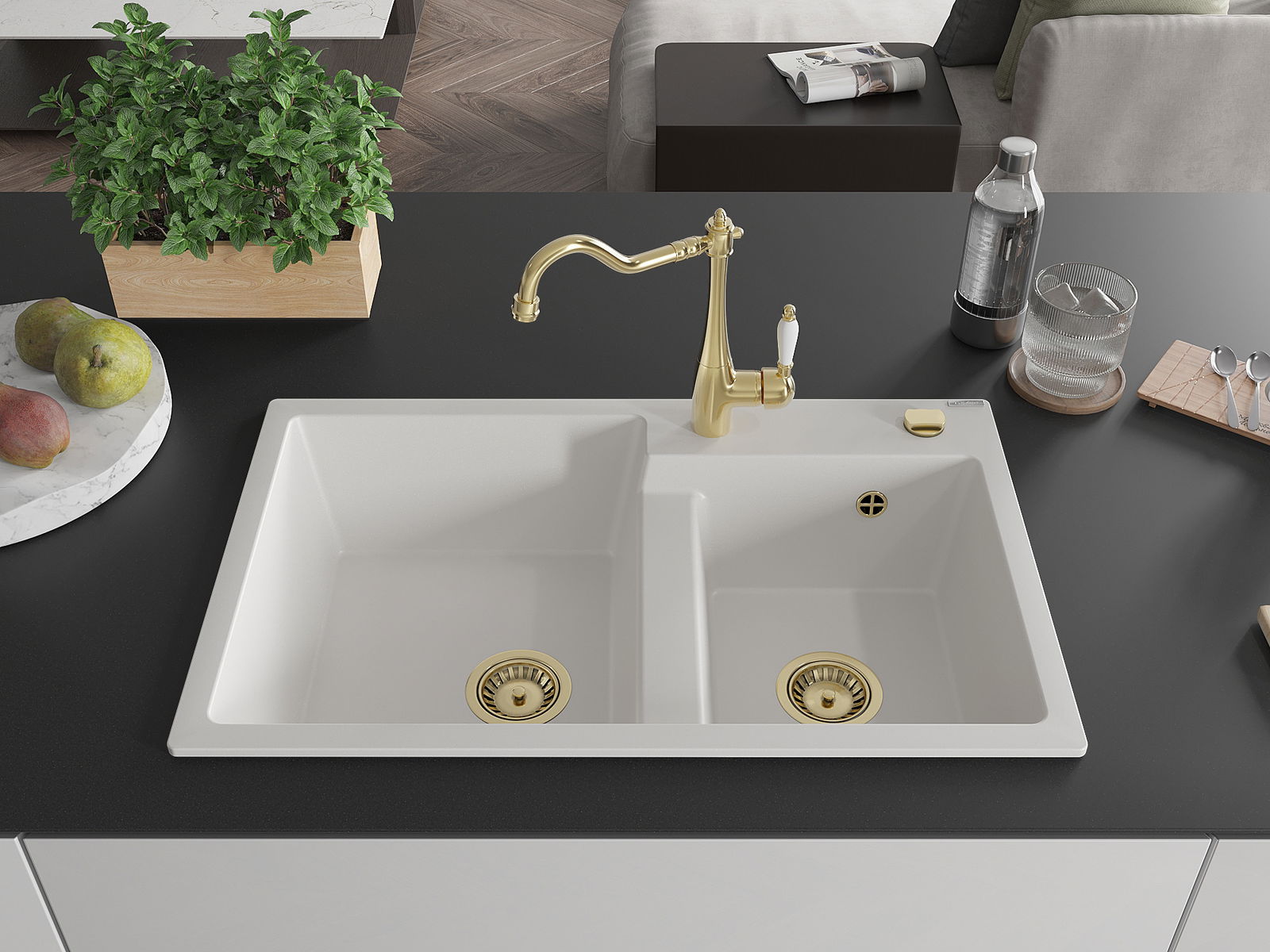 Dřez má předfrézovaný otvor o průměru 35 mm k samostatnému proražení. Může být použit například k montáži dávkovače na tekutinu, který eliminuje přítomnost plastových lahví v kuchyni a dodá jí elegantní finiš.