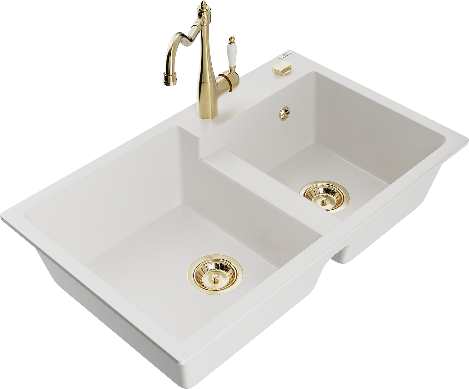 Mexen Tomas žulový dřez dvoukomorový s kuchyňskou baterií Carla, bílý - 6516-20-670700-50