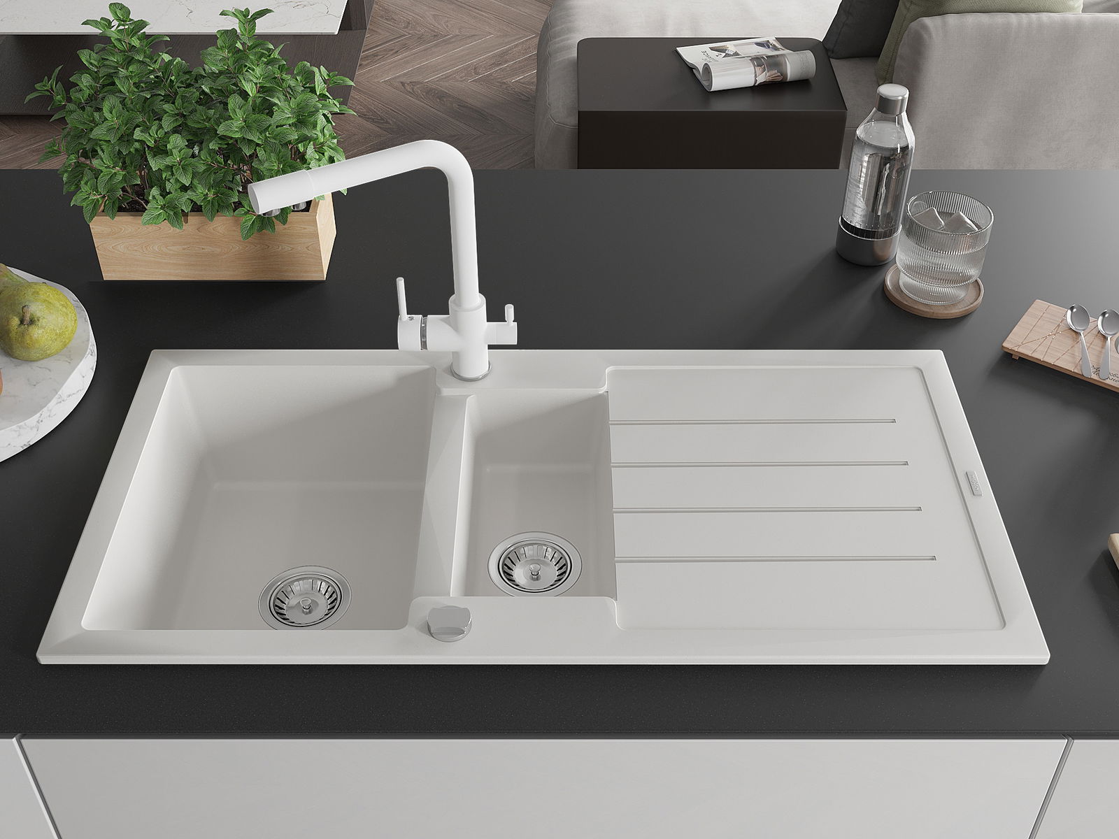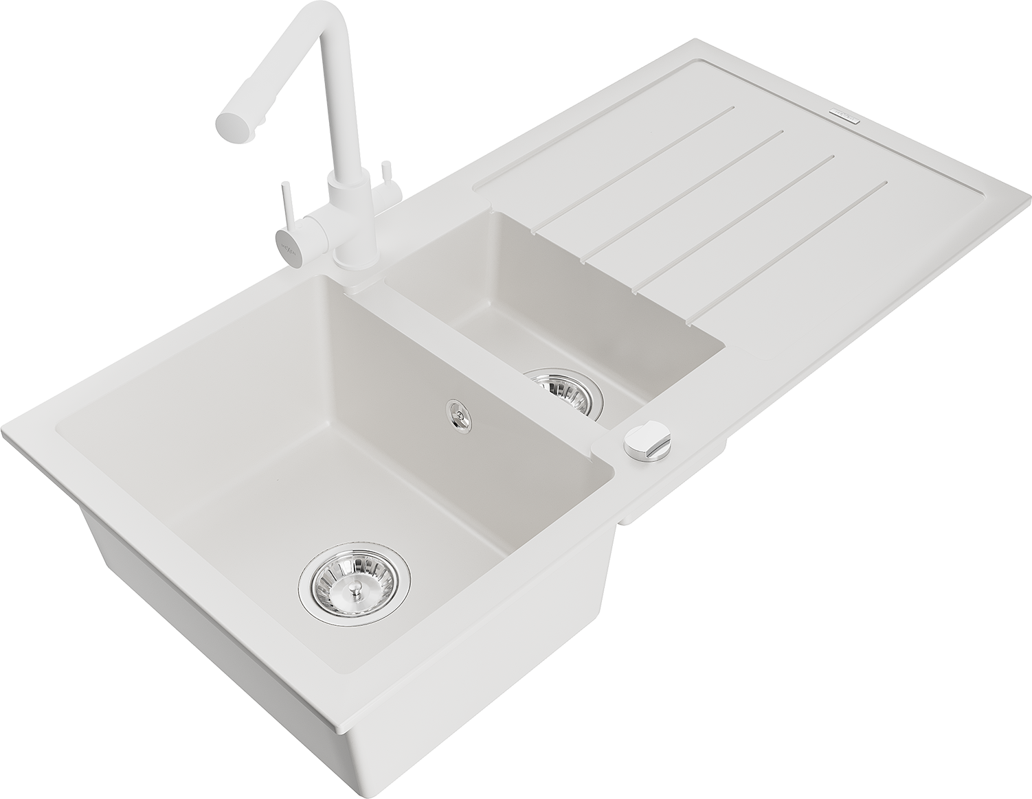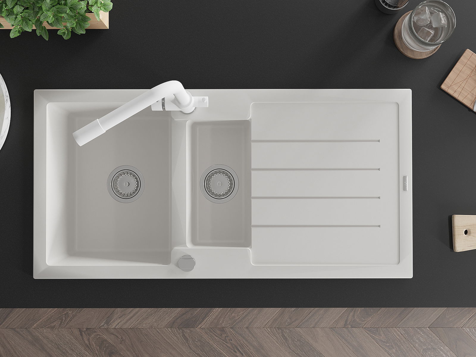 Mexen Andres kamenný dřez 1,5-komorový s odkapávačem a kuchyňskou baterií Duero, bílý - 6515-20-671600-20