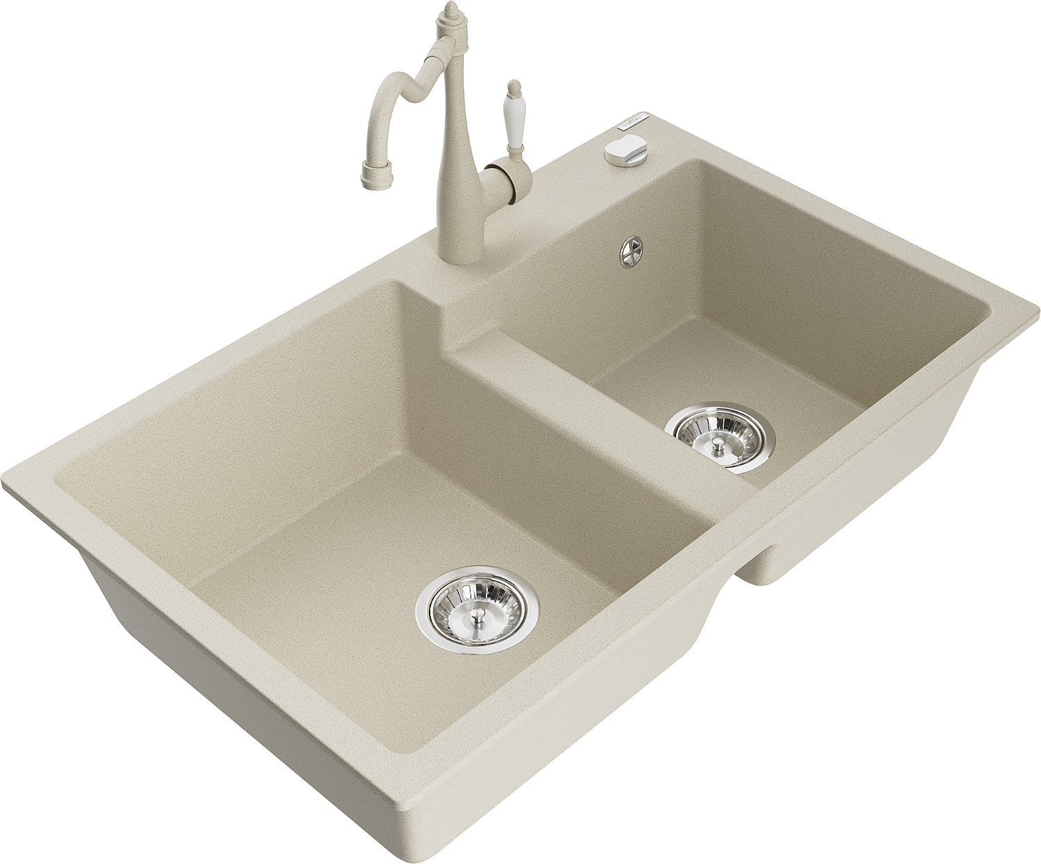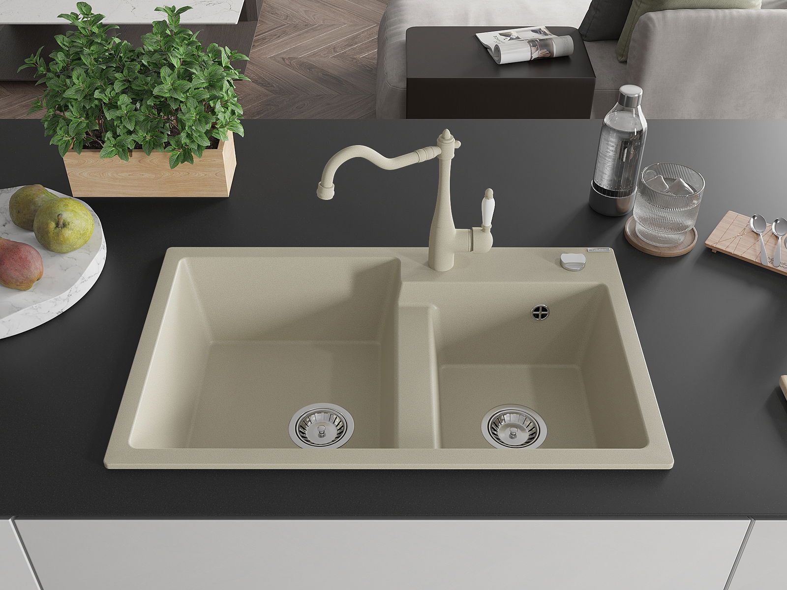 Mexen Tomas dvoukomorový žulový dřez s kuchyňskou baterií Carla, béžový - 6516-69-670700-69