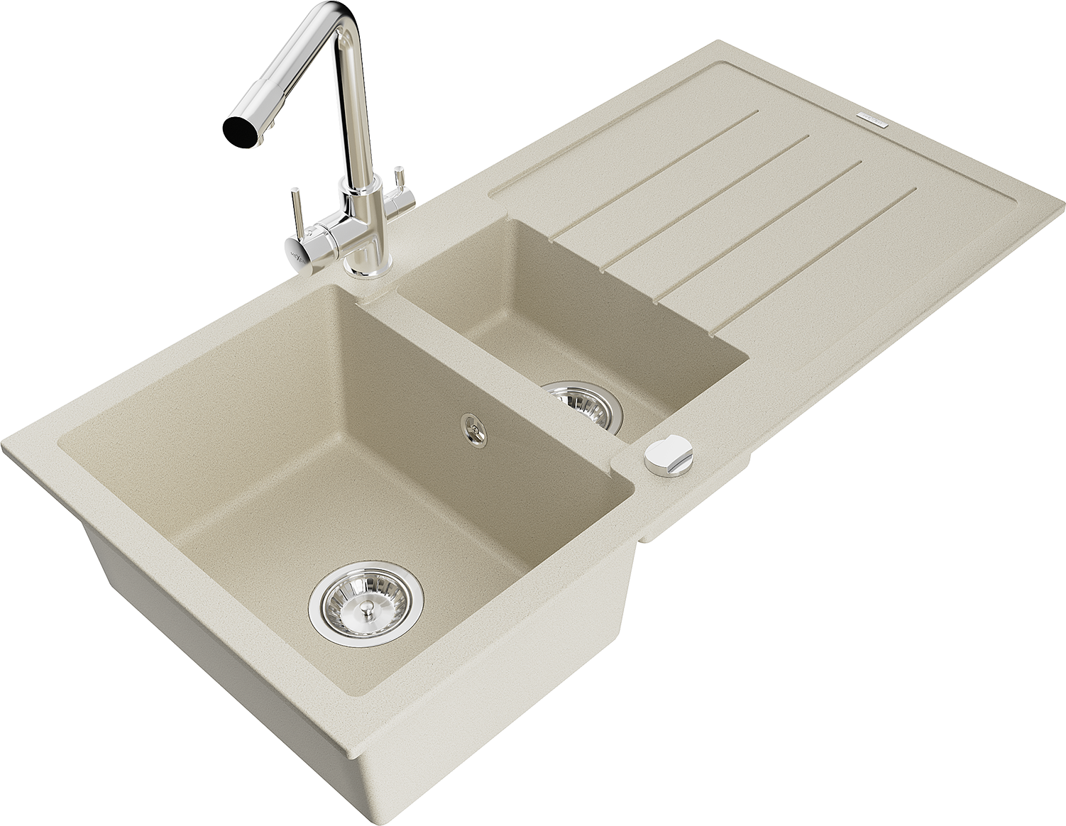 Mexen Andres granitový dřez 1,5-komorový s odkapávačem a kuchyňskou baterií Duero, béžový - 6515-69-671600-00