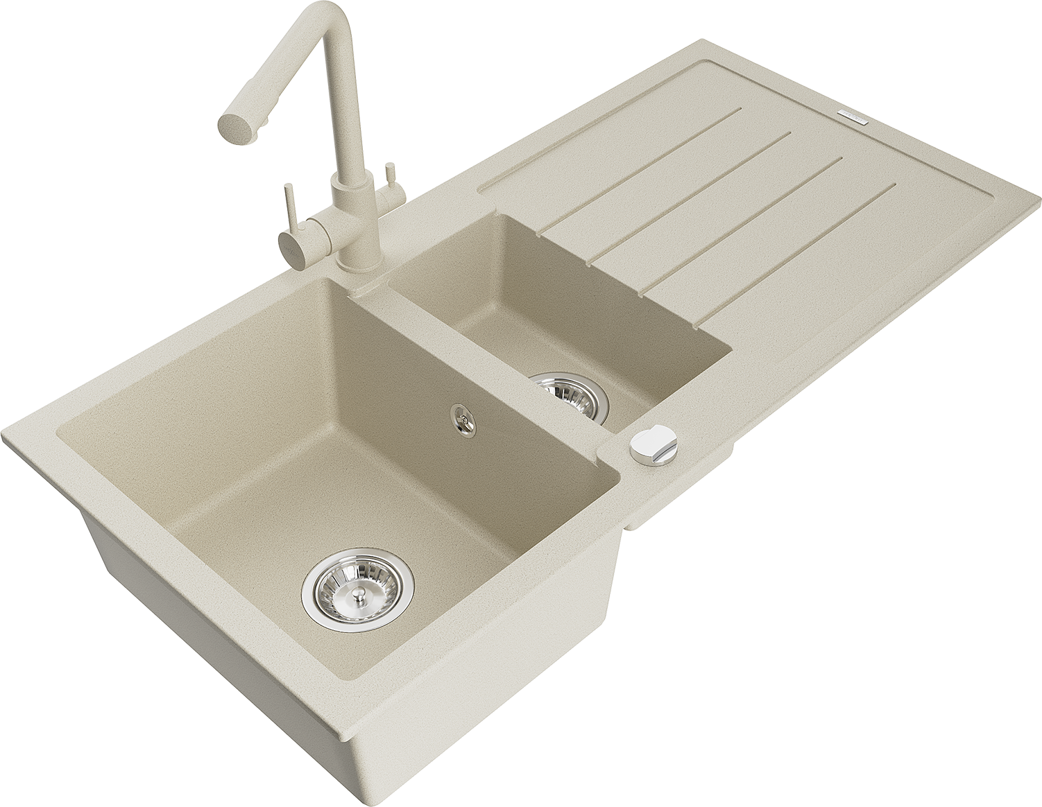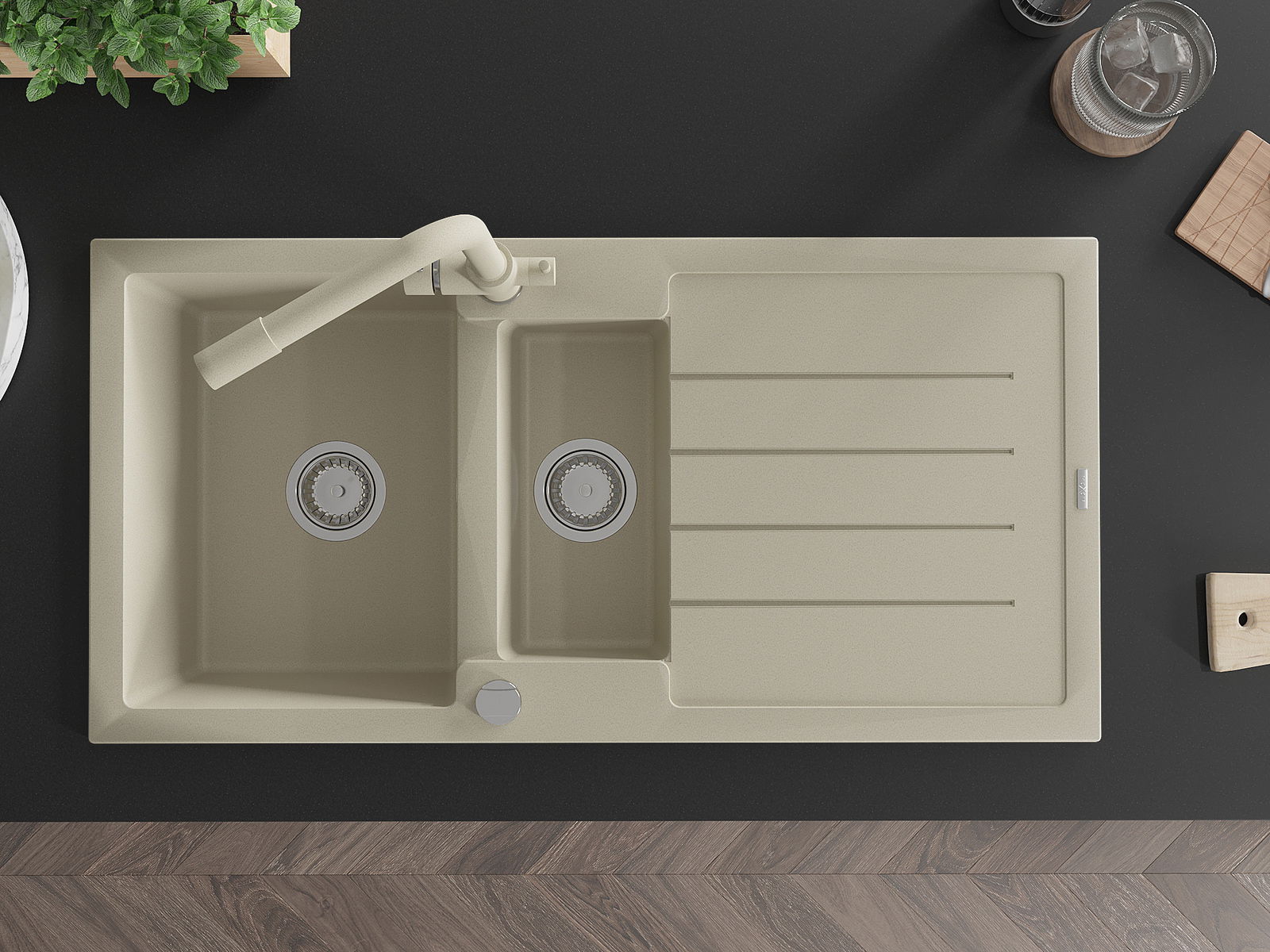 Mexen Andres granitový dřez 1,5-komorový s odkapávačem a kuchyňskou baterií Duero, béžový - 6515-69-671600-69