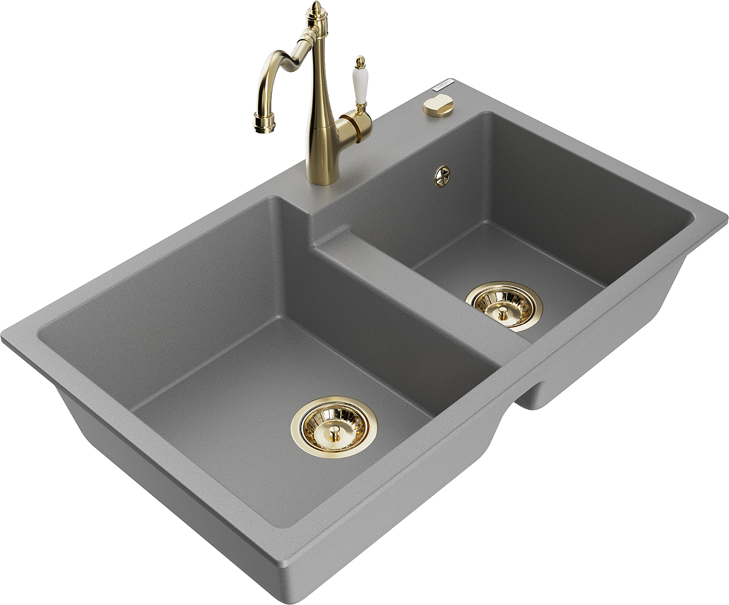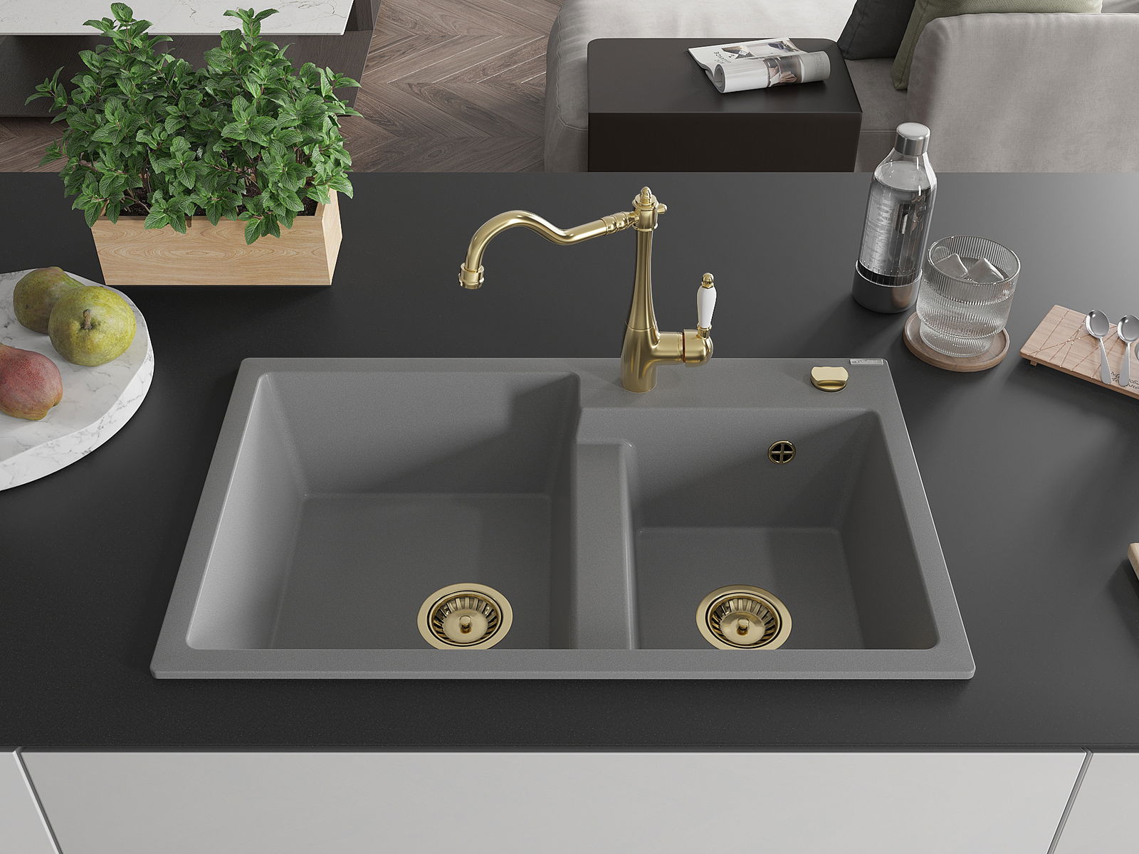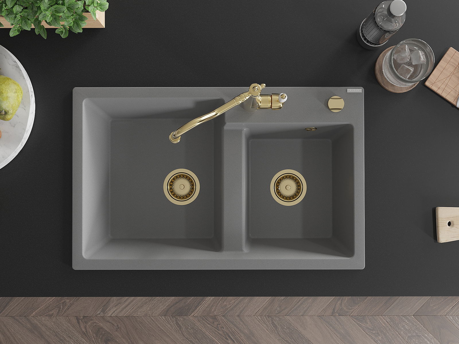 Mexen Tomas granitový dřez 2-komorový s kuchyňskou baterií Carla, šedý - 6516-71-670700-50