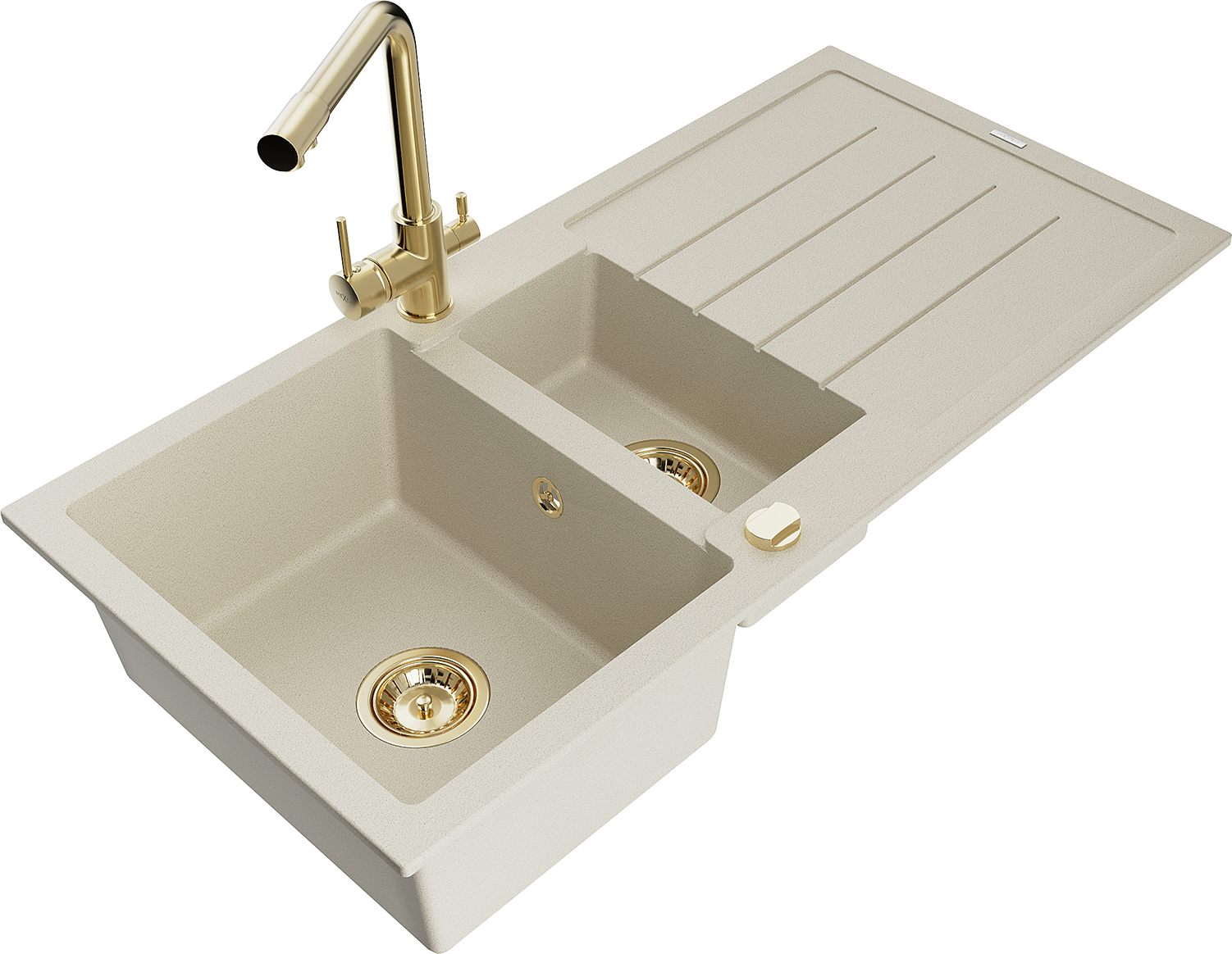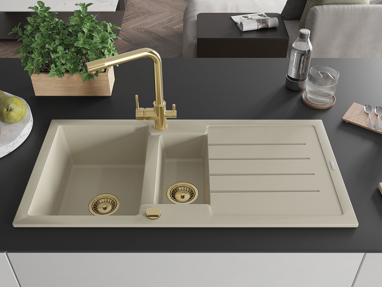 Mexen Andres granitový dřez 1,5-komorový s odkapávačem a kuchyňskou baterií Duero, béžový - 6515-69-671600-50