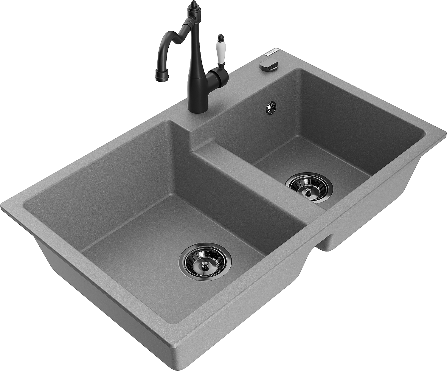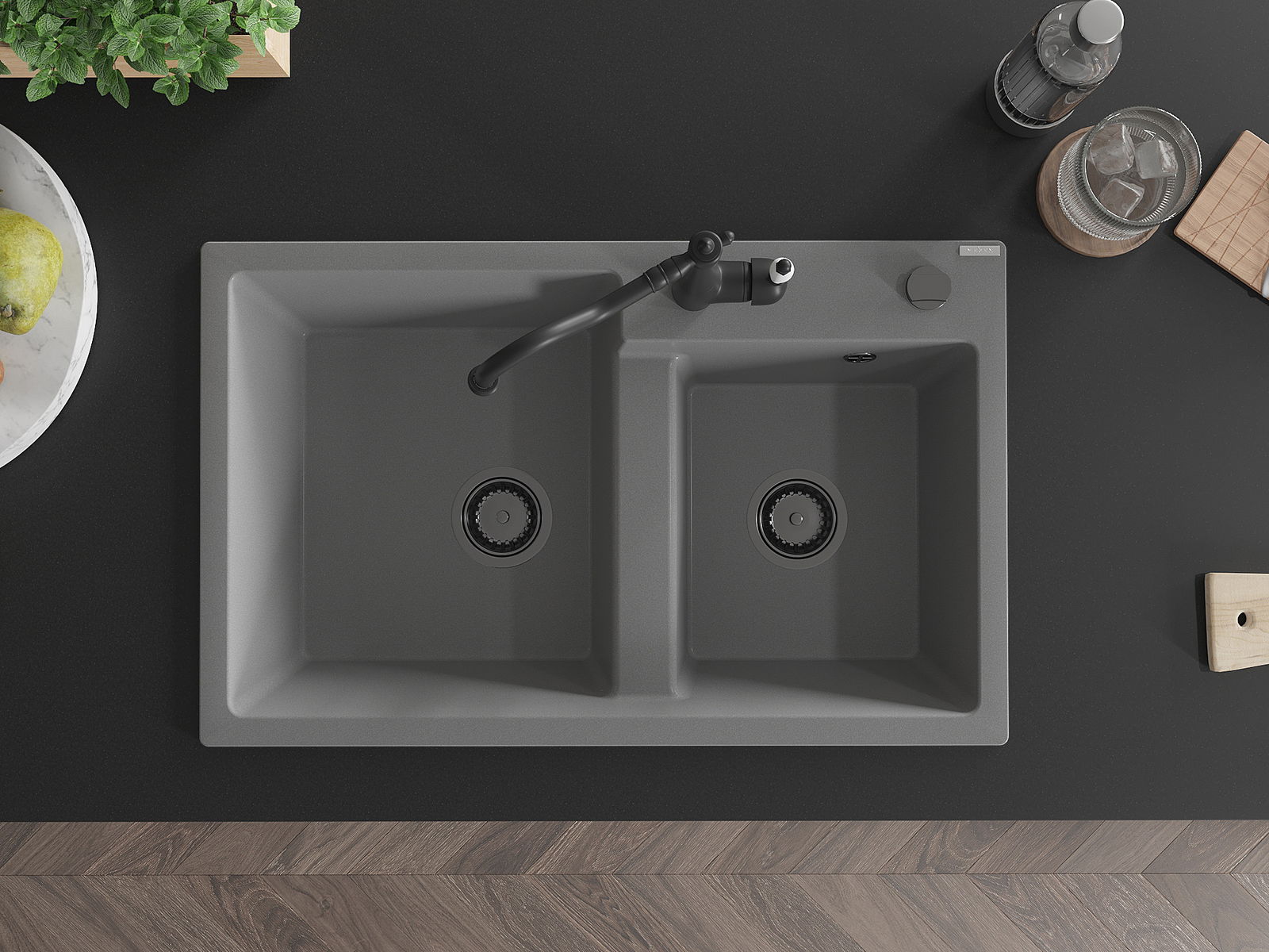 Mexen Tomas žulový dřez dvoukomorový s kuchyňskou baterií Carla, šedý - 6516-71-670700-70-B