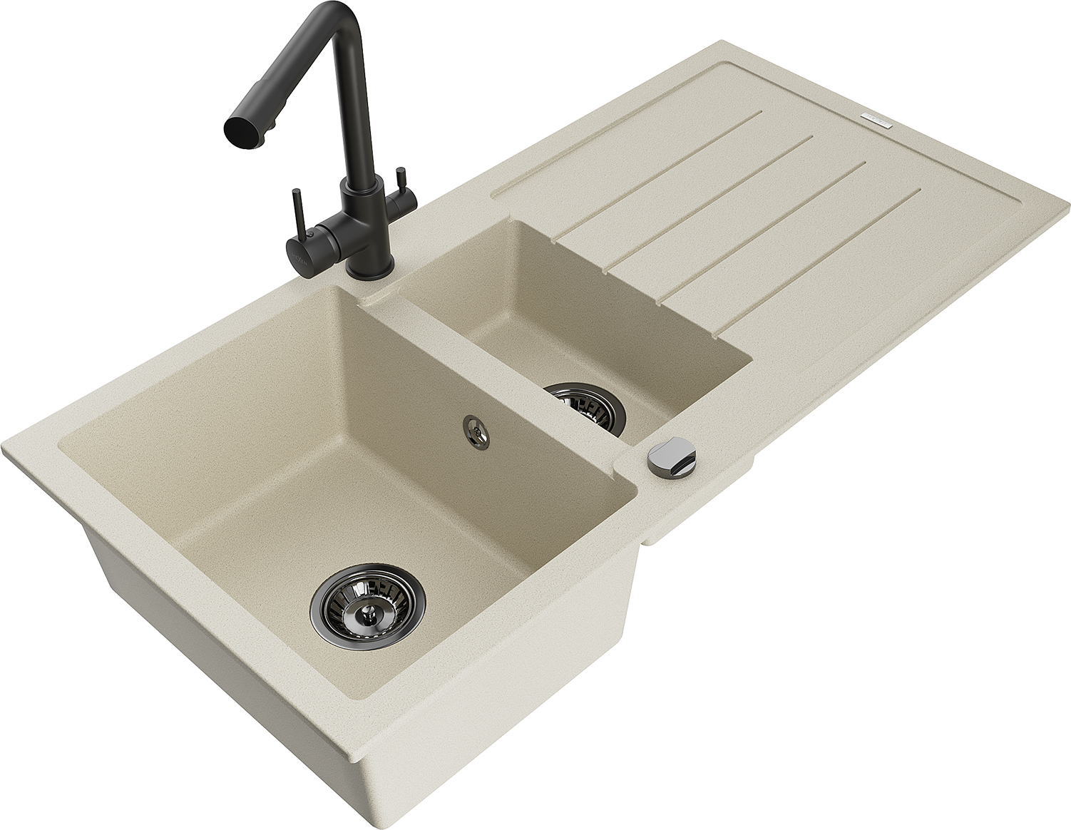 Mexen Andres granitový dřez 1,5-komorový s odkapávačem a kuchyňskou baterií Duero, béžový - 6515-69-671600-70