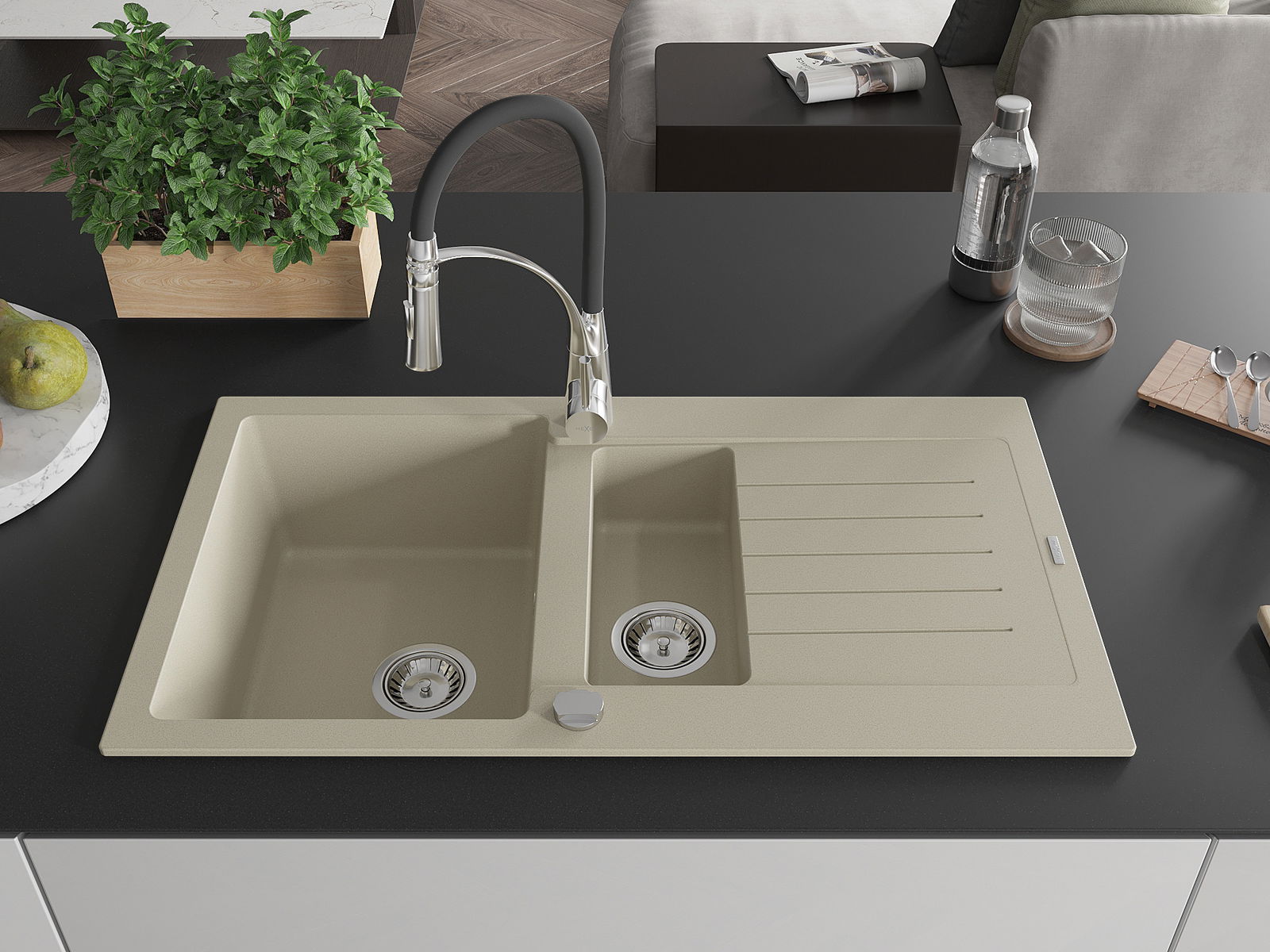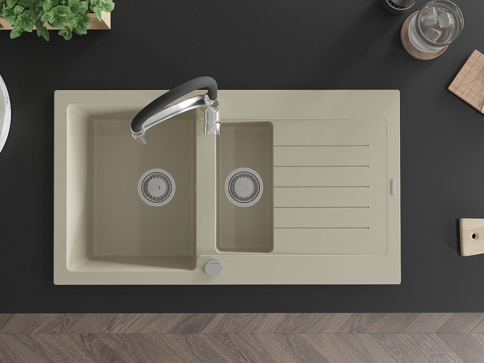 Mexen Matias žulový dřez 1,5-komorový s odkapávačem a kuchyňskou baterií Aster, béžový - 6502-69-73450-07