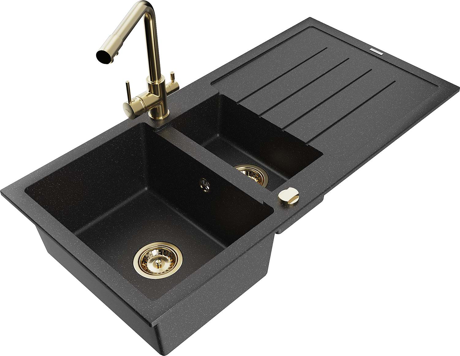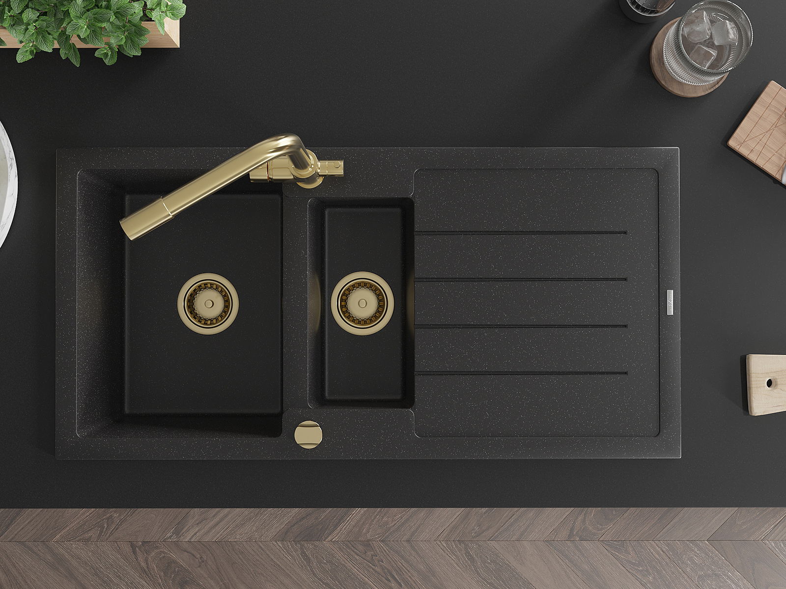 Mexen Andres granitový dřez 1,5-komorový s odkapávačem a kuchyňskou baterií Duero, černý/stříbrný - 6515-73-671600-50