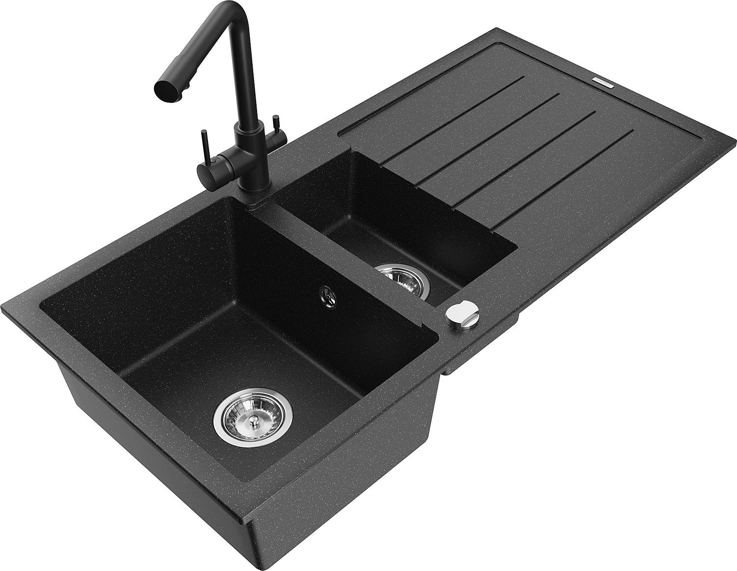 Mexen Andres granitový dřez 1,5-komorový s odkapávačem a kuchyňskou baterií Duero, černý/stříbrný - 6515-73-671600-70
