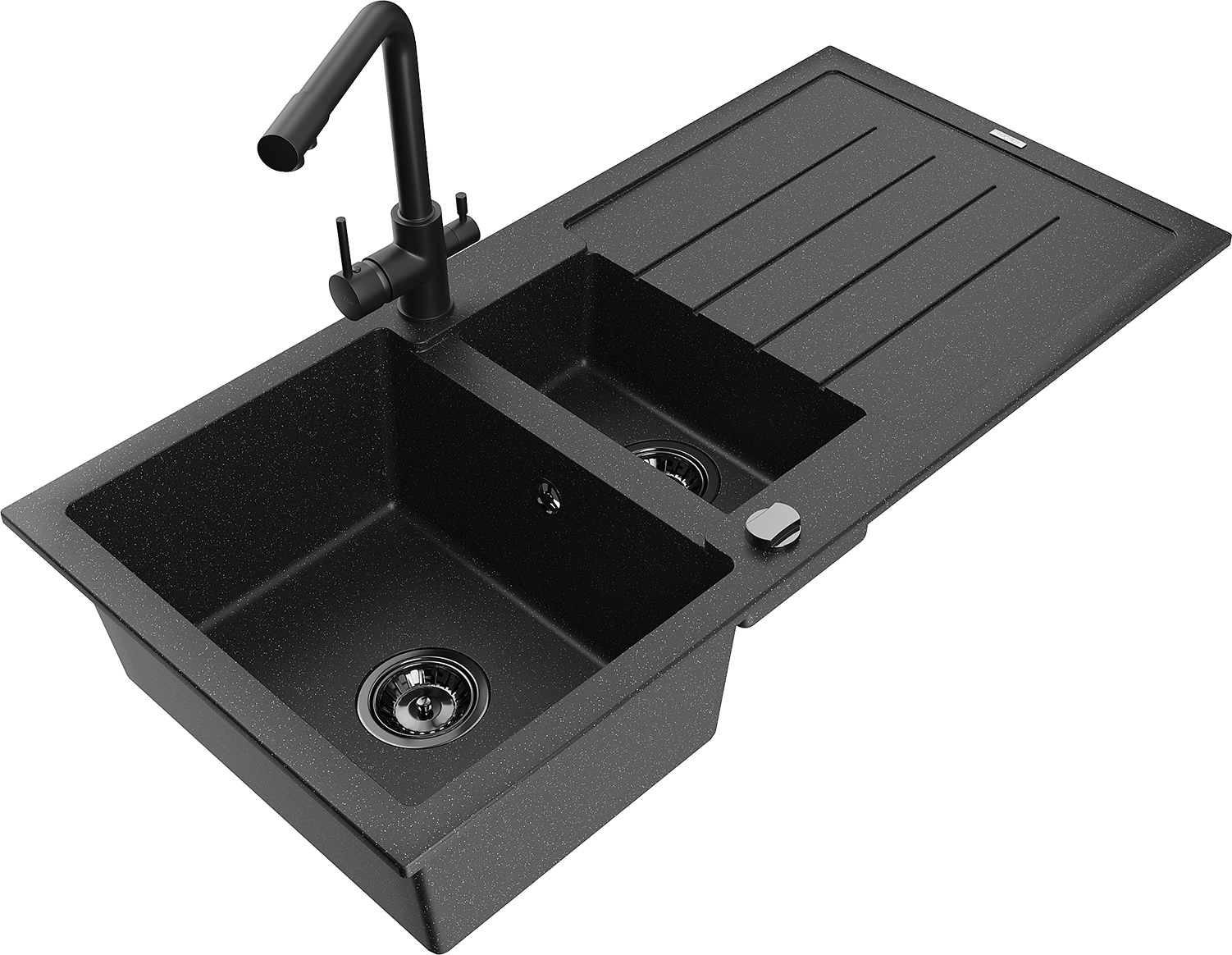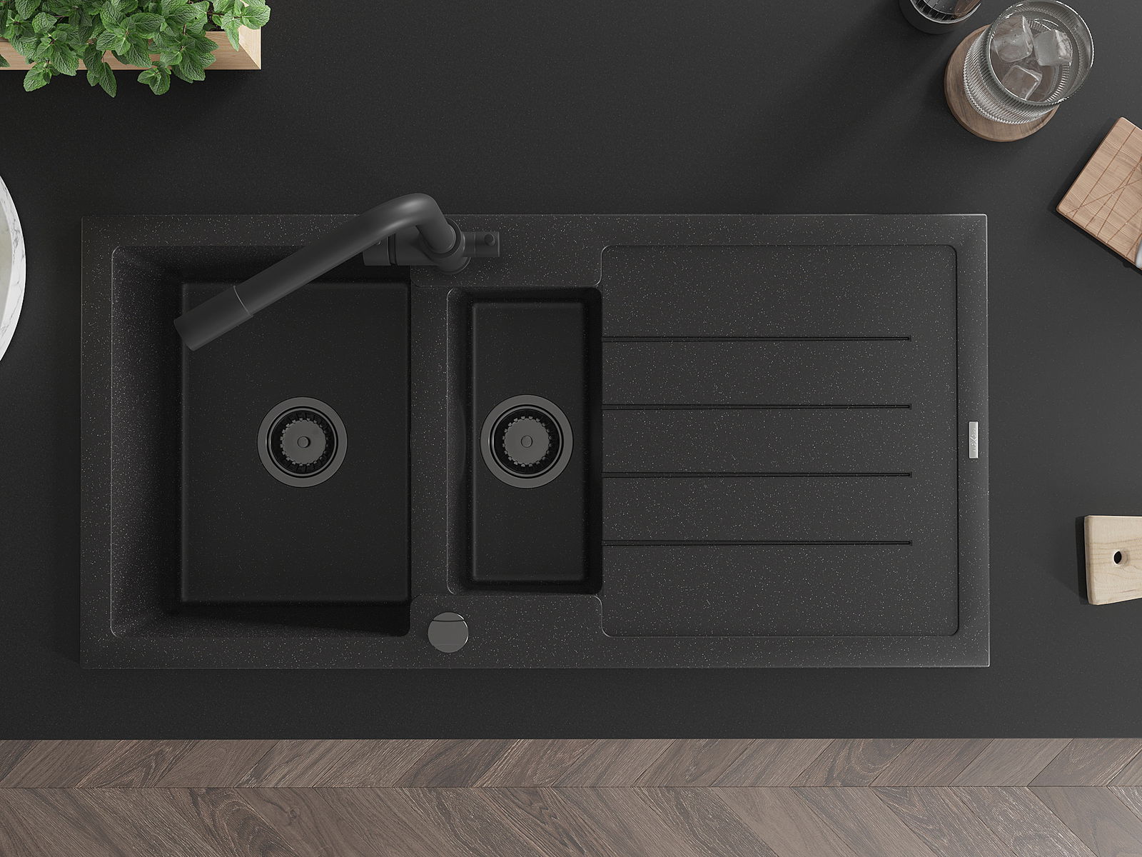 Mexen Andres granitový dřez 1,5komorový s odkapávačem a kuchyňskou baterií Duero, černý/stříbrný - 6515-73-671600-70-B