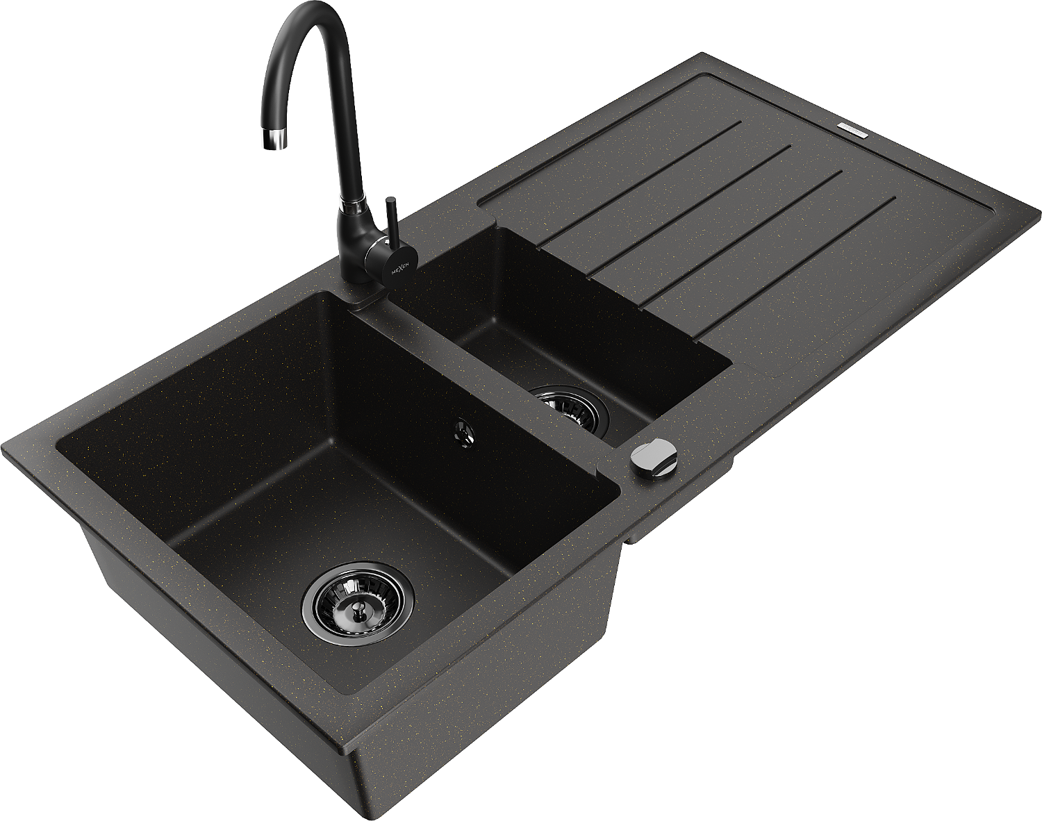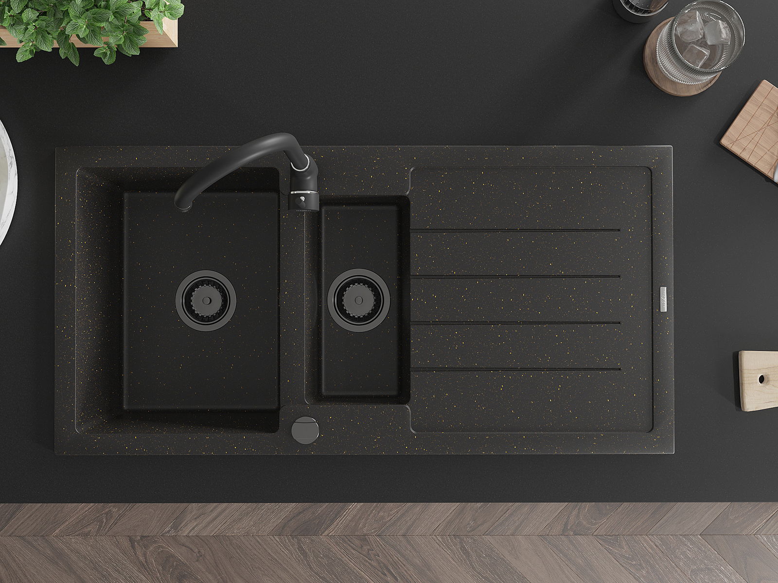 Mexen Andres granitový dřez 1,5-komorový s odkapávačem a kuchyňskou baterií Telma, černý/zlatý - 6515-75-670200-70-B