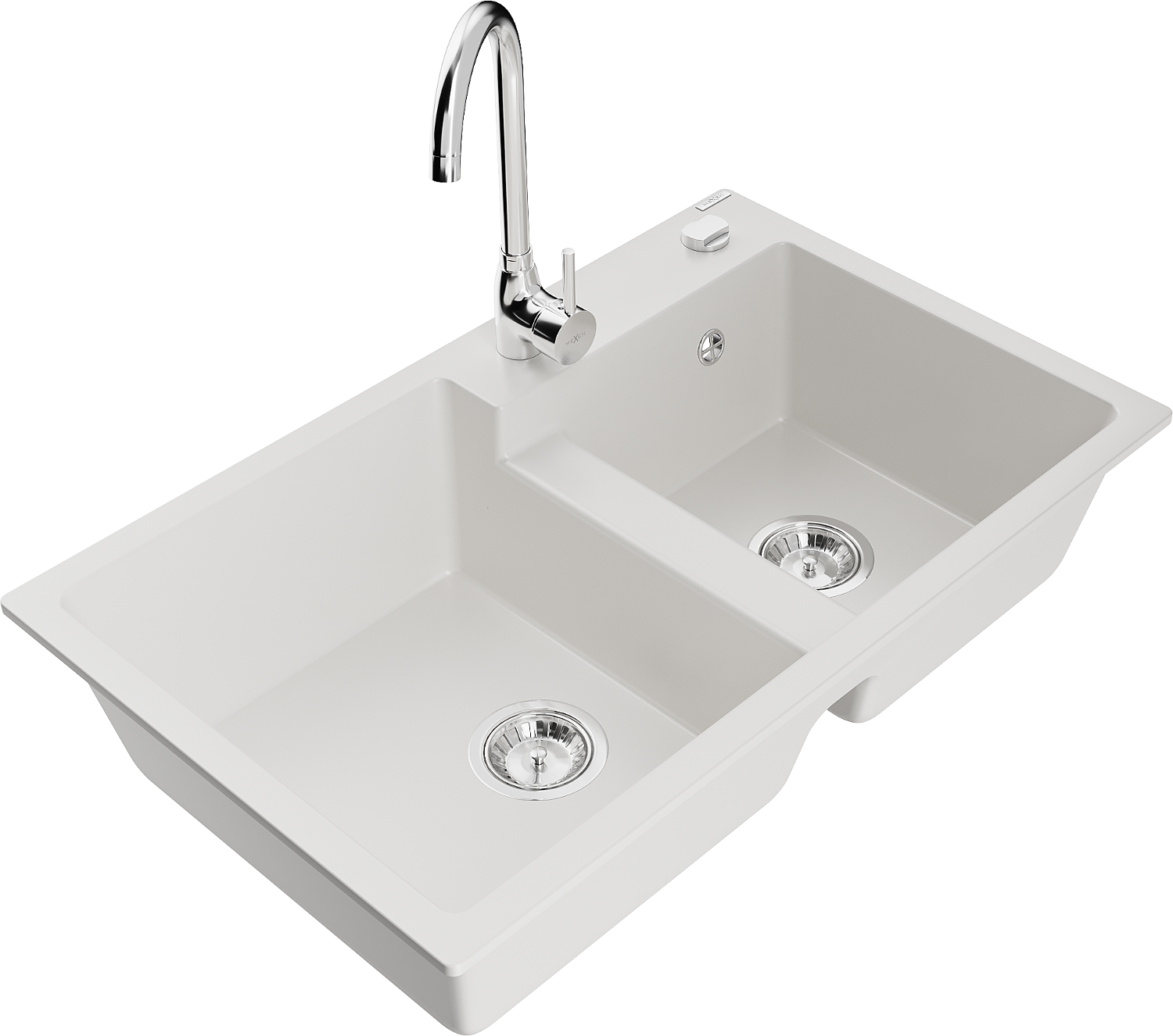 Mexen Tomas granitový dřez dvoukomorový s kuchyňskou baterií Telma, bílý - 6516-20-670200-00