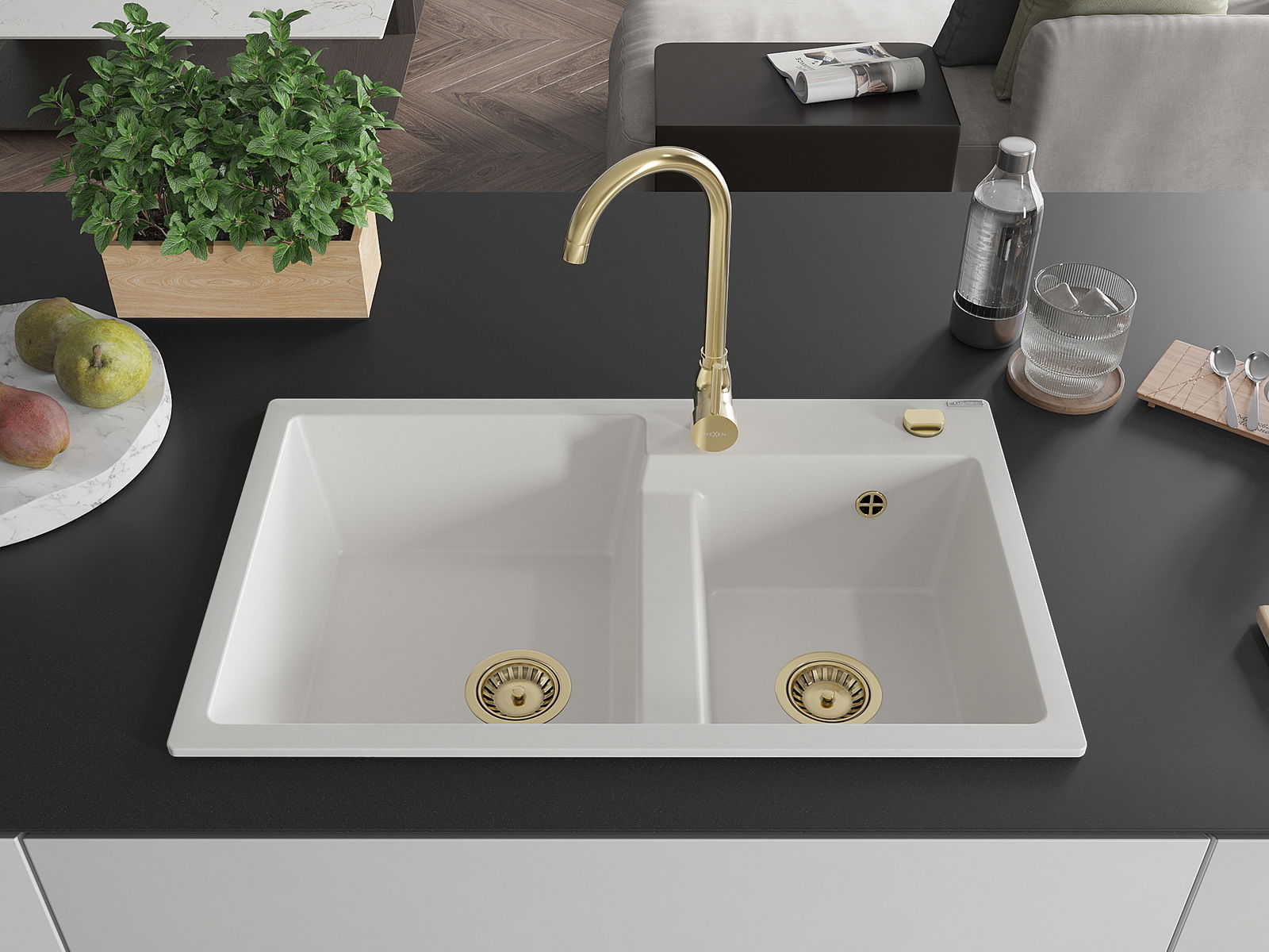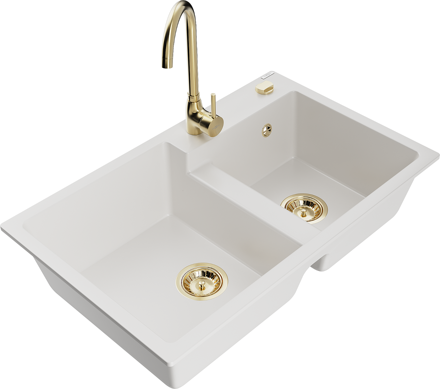 Mexen Tomas žulový dřez 2-komorový s kuchyňskou baterií Telma, bílý - 6516-20-670200-50