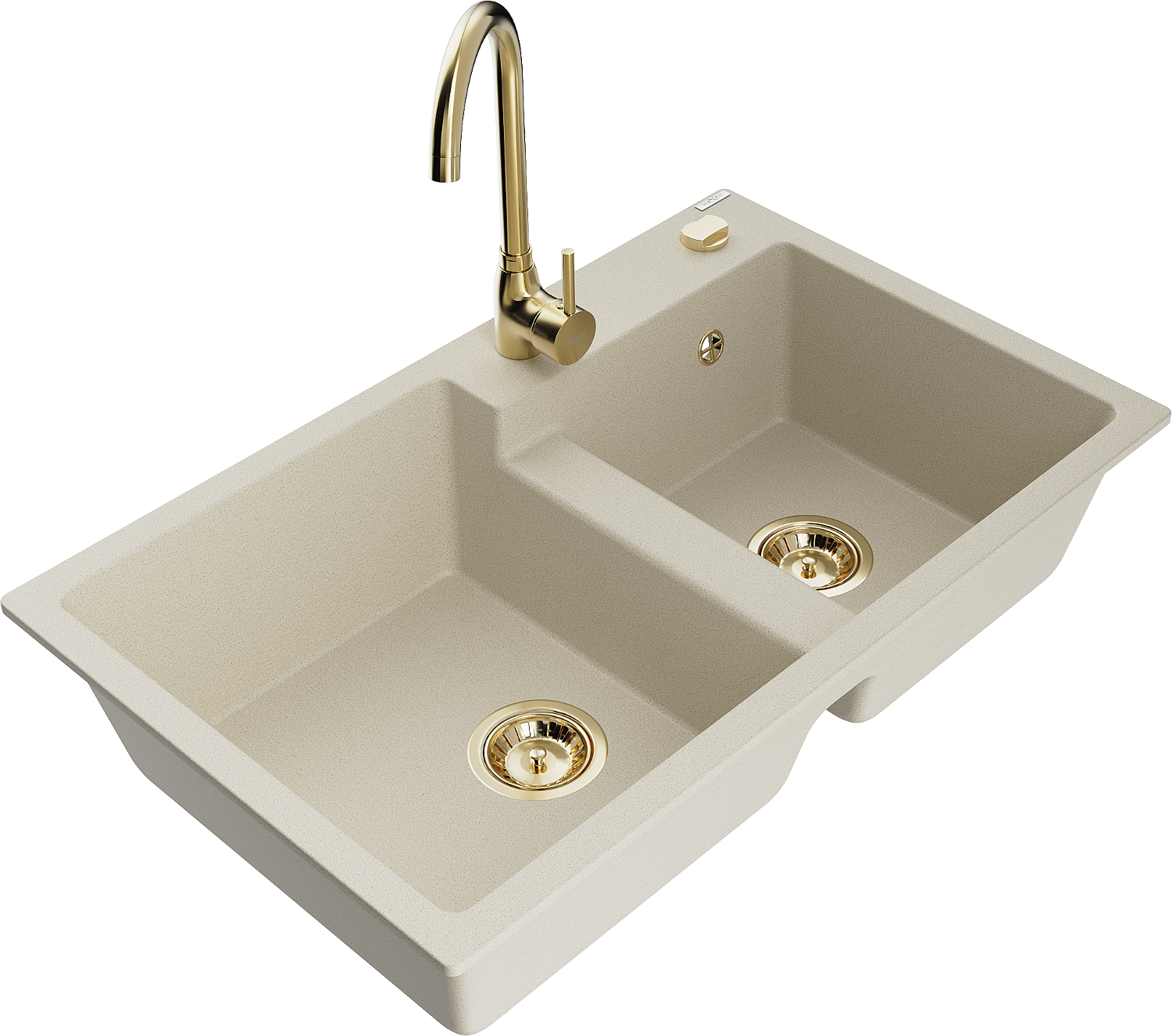 Mexen Tomas žulový dřez dvoukomorový s kuchyňskou baterií Telma, béžový - 6516-69-670200-50