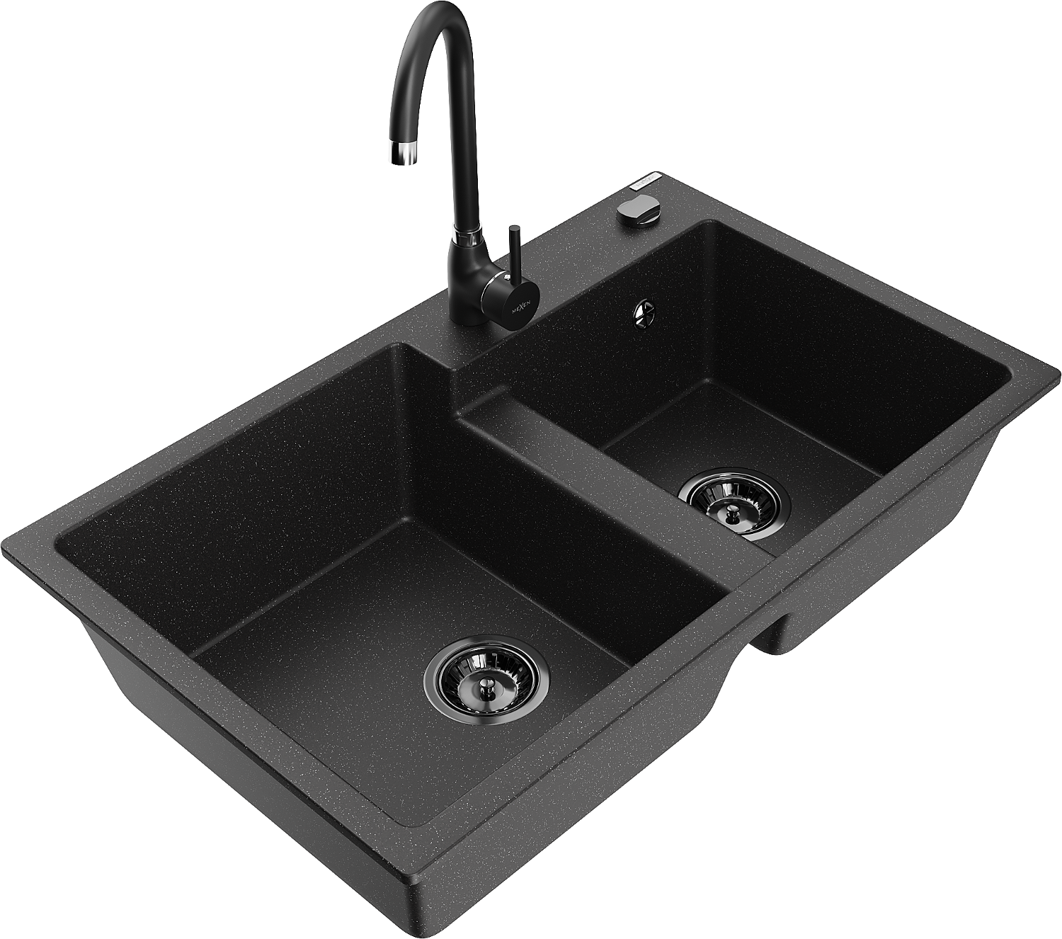 Mexen Tomas dvoukomorový dřez s granitovou kuchyňskou baterií Telma, černý/stříbrný metalik - 6516-73-670200-70-B