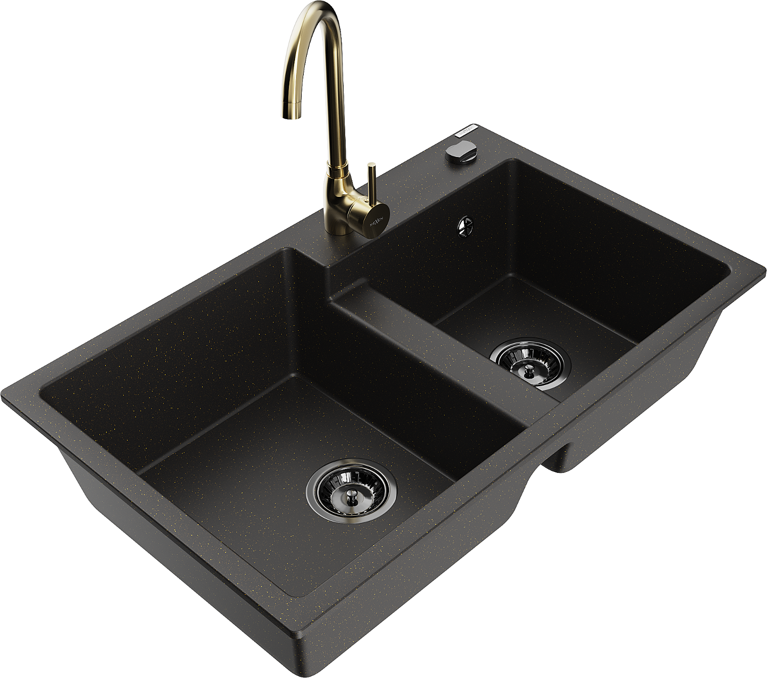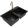 Mexen Tomas žulový dřez s 2 komorami a kuchyňskou baterií Telma, černý/zlatý metalický - 6516-75-670200-50-B