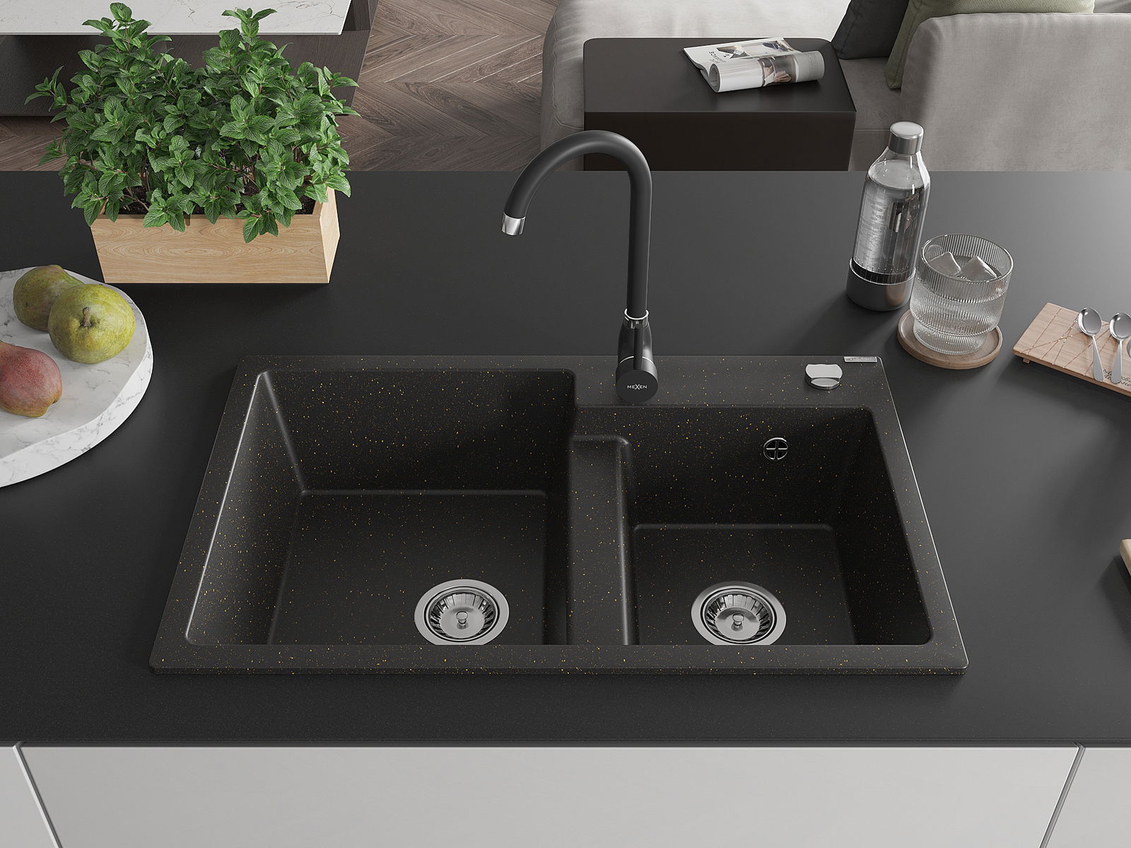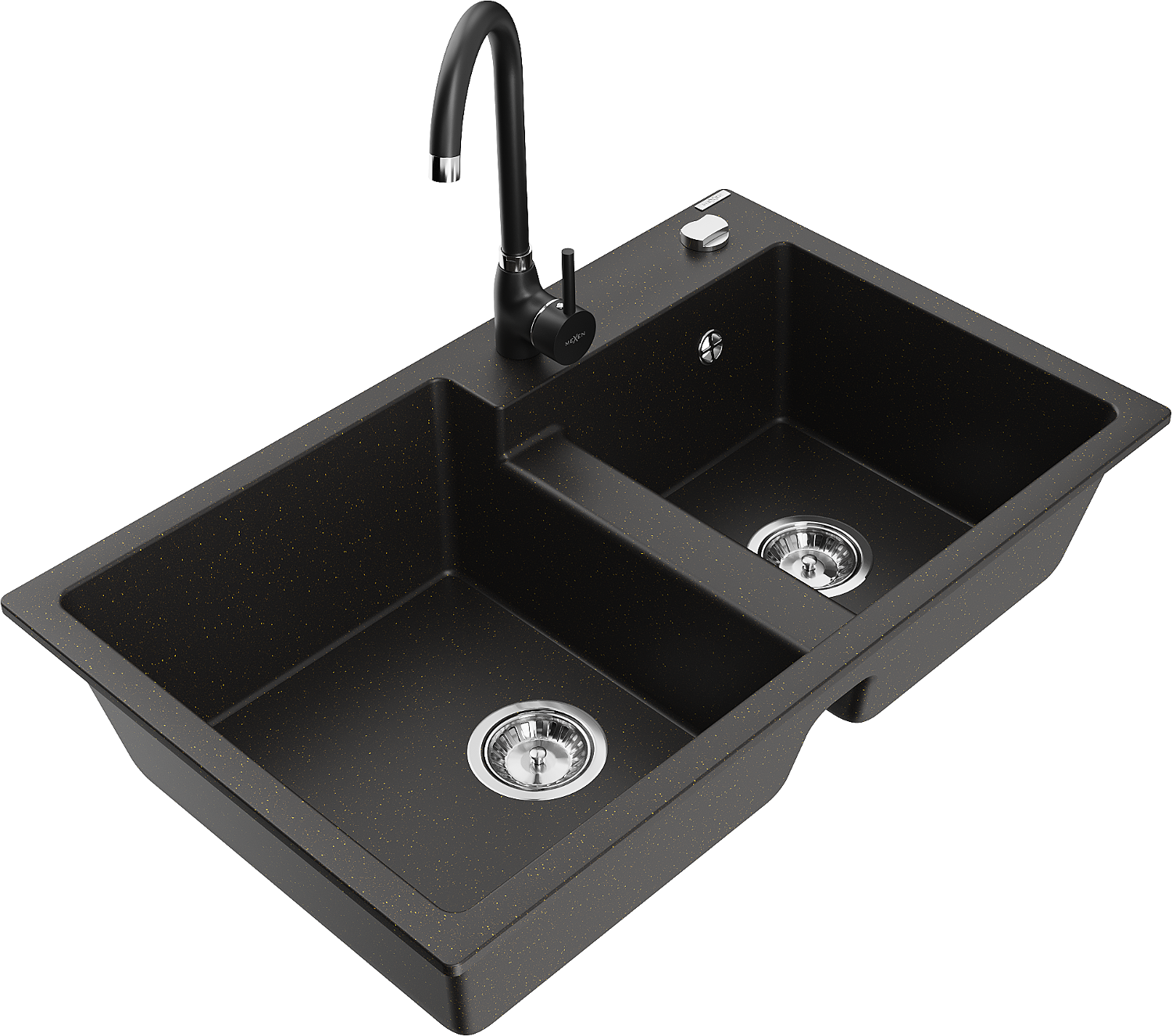 Mexen Tomas dřez granitový 2-komorový s kuchyňskou baterií Telma, černý/zlatý metalik - 6516-75-670200-70