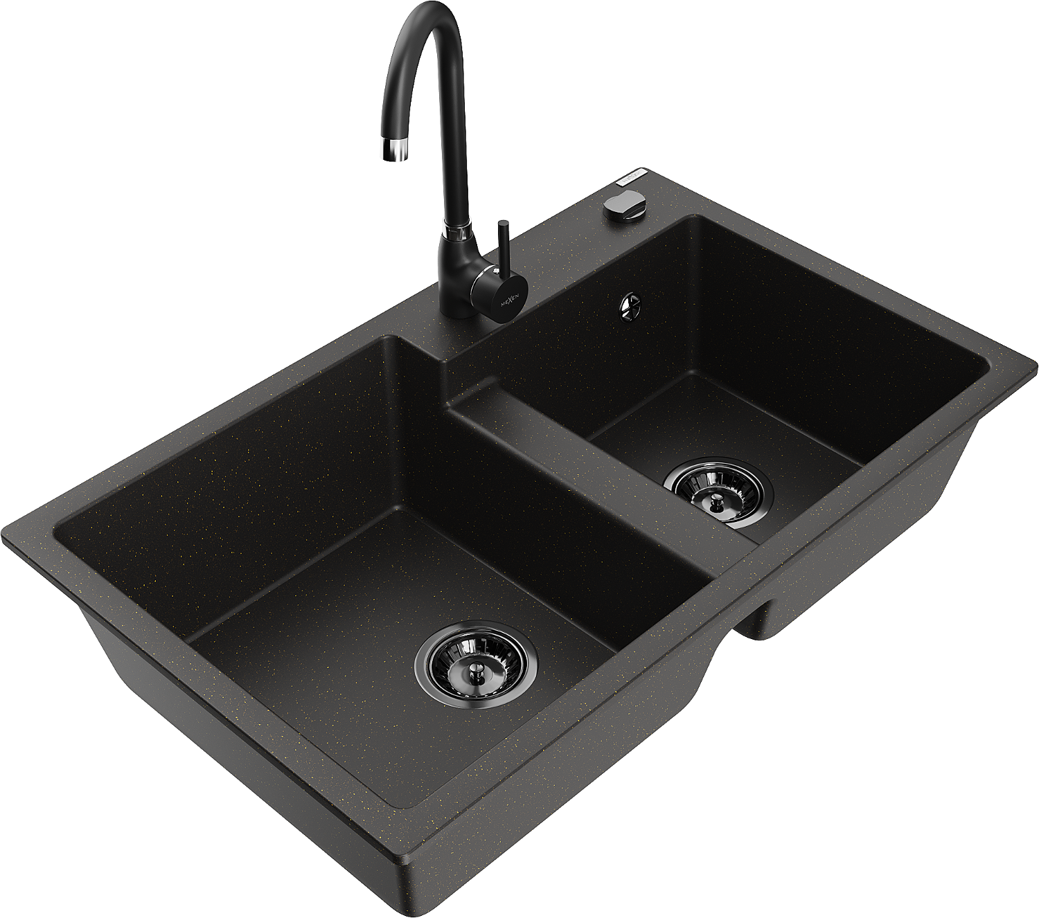 Mexen Tomas dvoukomorový granitový dřez s kuchyňskou baterií Telma, černý/zlatý metalik - 6516-75-670200-70-B