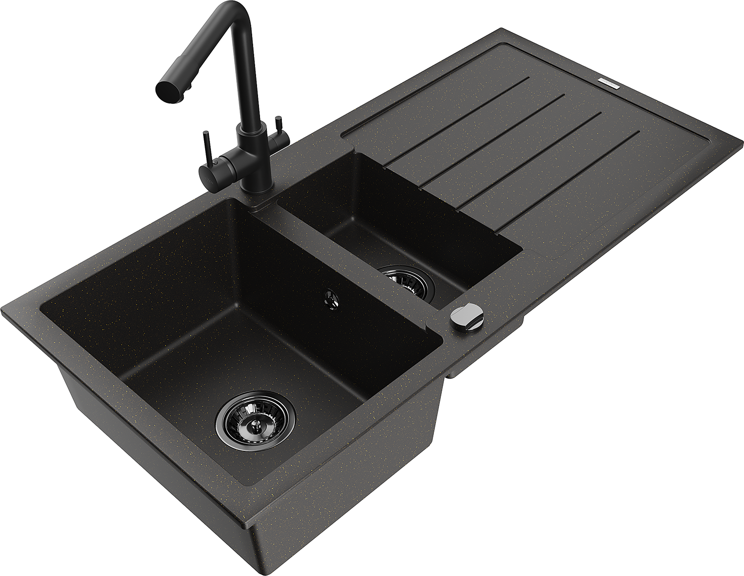 Mexen Andres granitový dřez 1,5-komorový s odkapávačem a kuchyňskou baterií Duero, černý/zlatý - 6515-75-671600-70-B