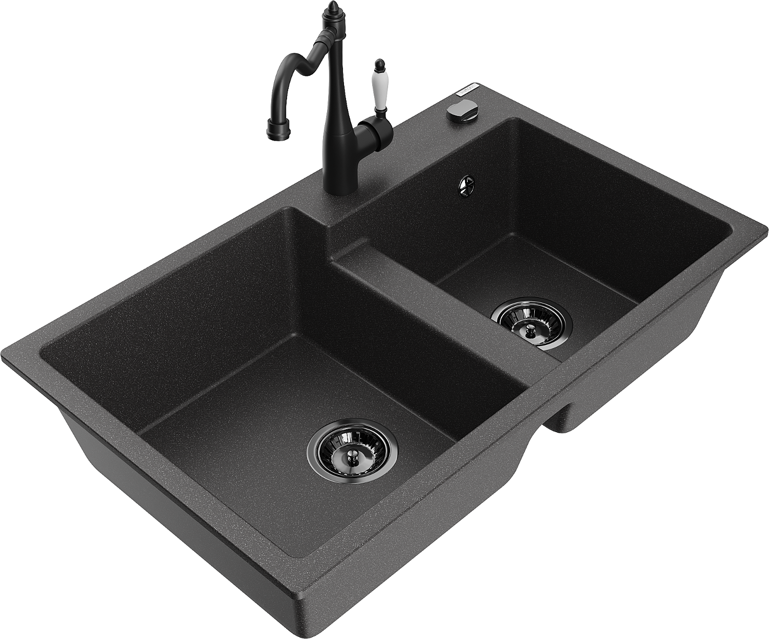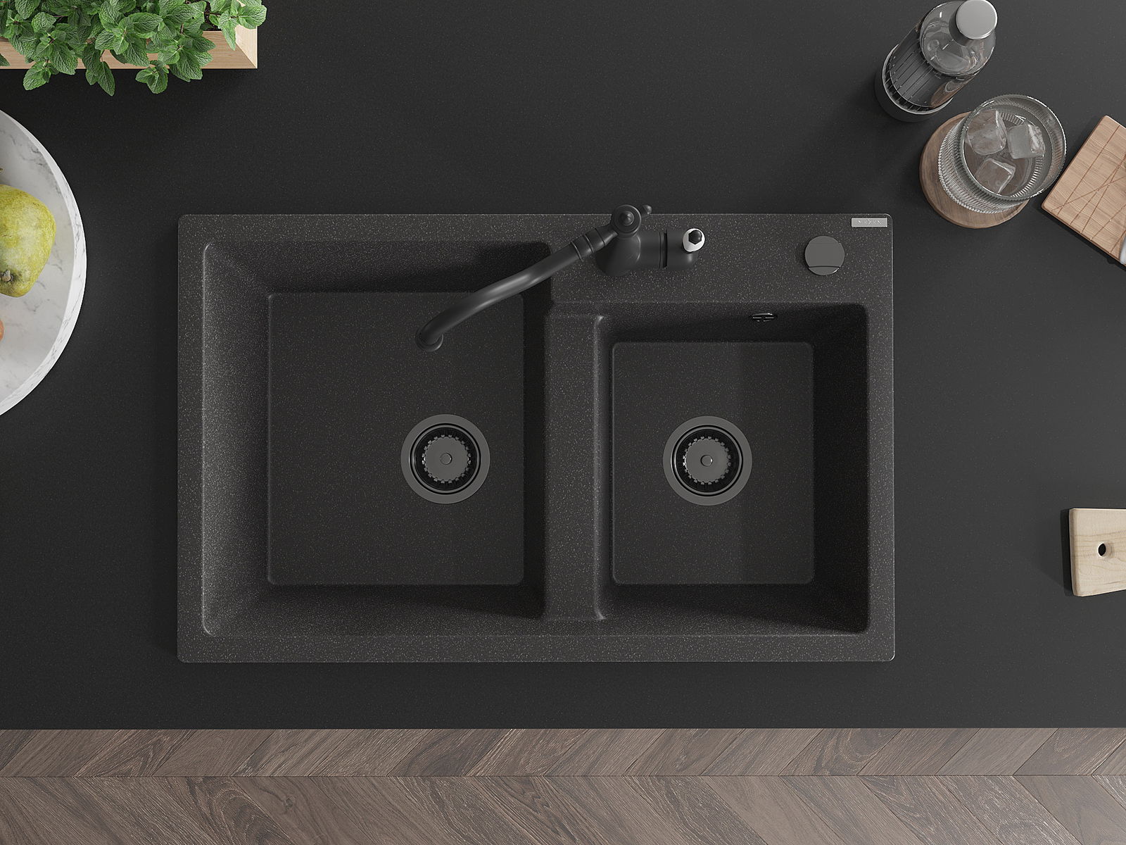 Mexen Tomas žulový dřez 2-komorový s kuchyňskou baterií Carla, černý tečkovaný - 6516-76-670700-70-B