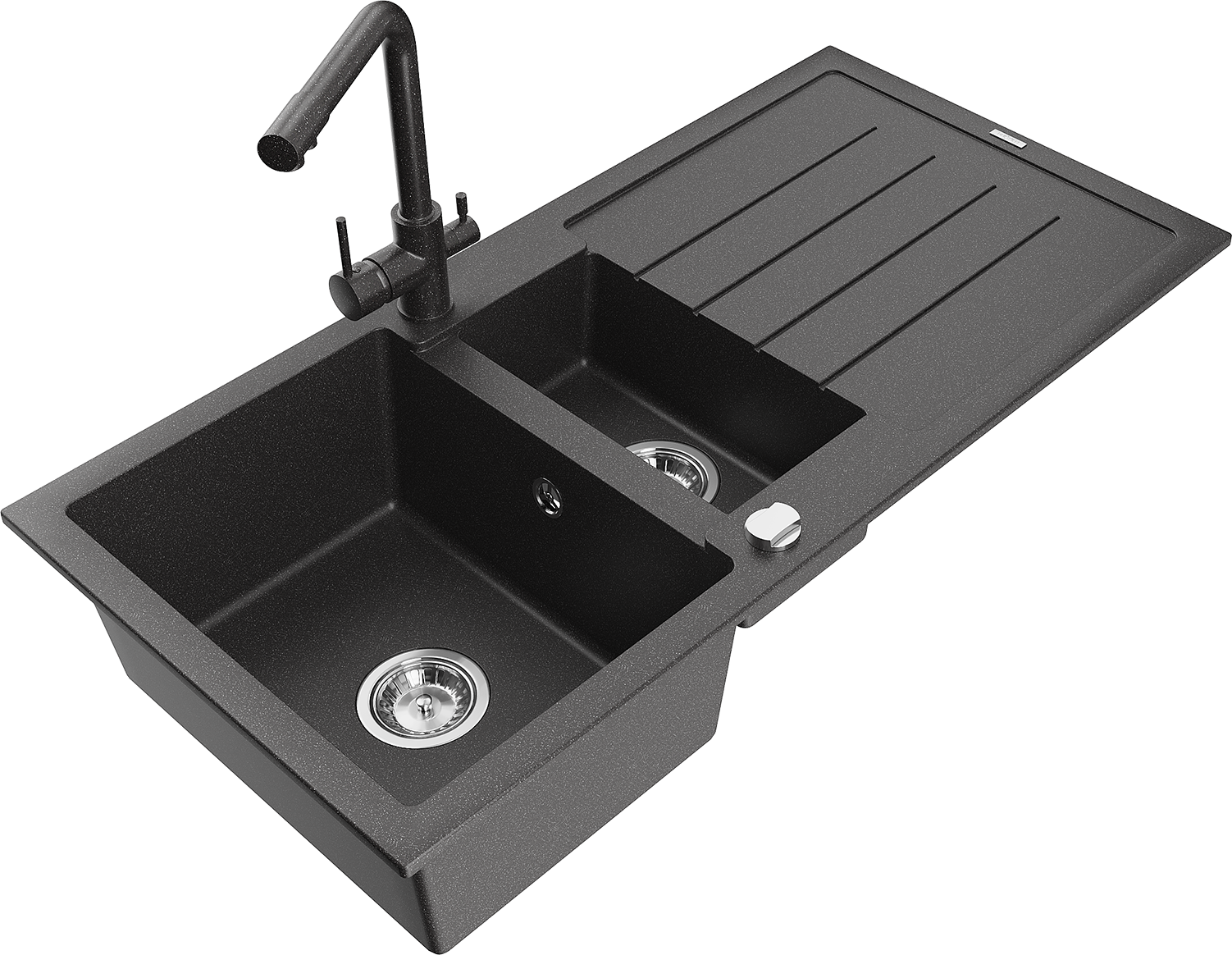 Mexen Andres granitový dřez 1,5-komorový s odkapávačem a kuchyňskou baterií Duero, černý skvrnitý - 6515-76-671600-76