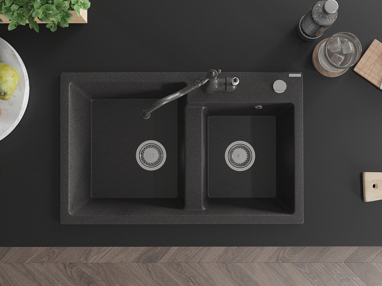 Mexen Tomas žulový kuchyňský dřez s 2 komorami a kuchyňskou baterií Carla, černý tečkovaný - 6516-76-670700-76