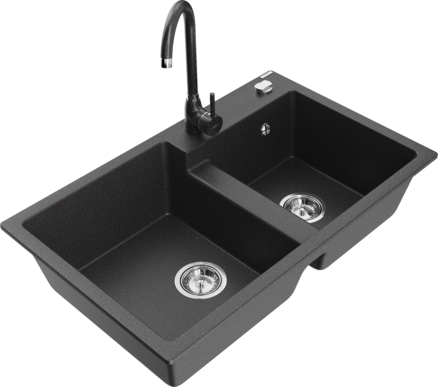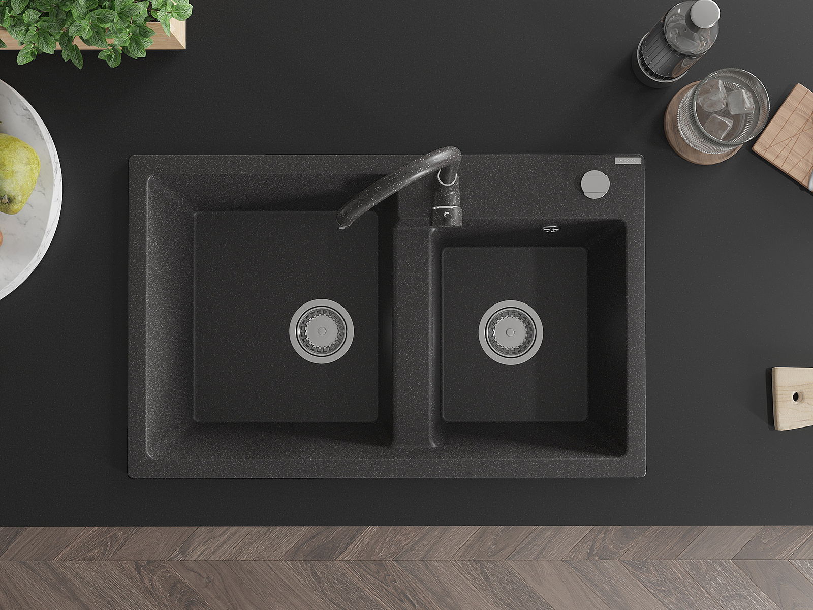 Mexen Tomas dřez granitový 2-komorový s kuchyňskou baterií Telma, černý s kropením - 6516-76-670200-76