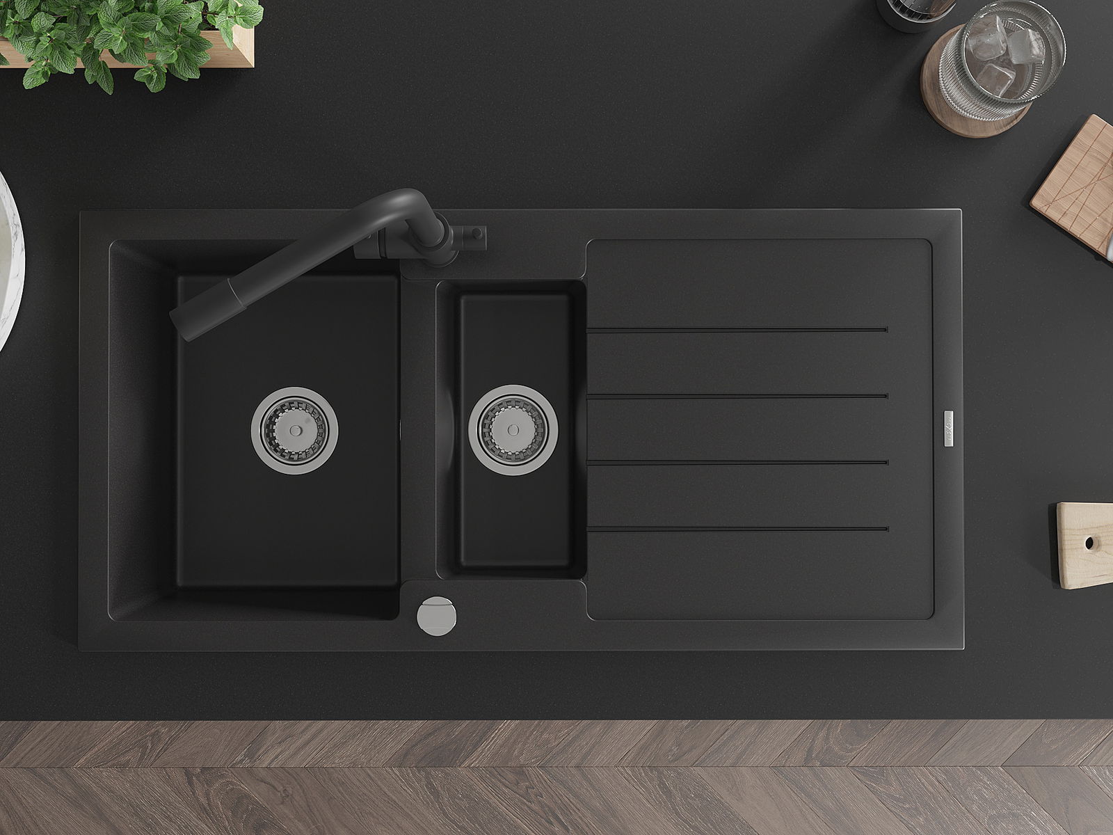 Mexen Andres granitový dřez 1,5-komorový s odkapávačem a kuchyňskou baterií Duero, černý - 6515-77-671600-70