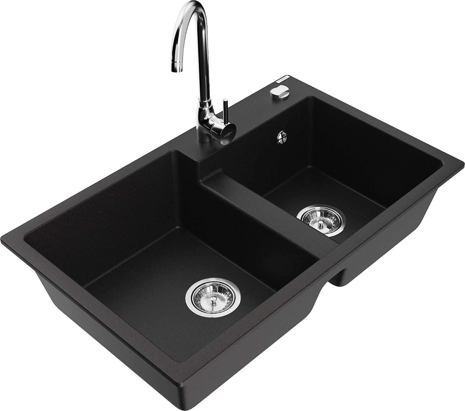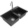 Mexen Tomas dřez žulový dvoukomorový s kuchyňskou baterií Telma, černý - 6516-77-670200-00