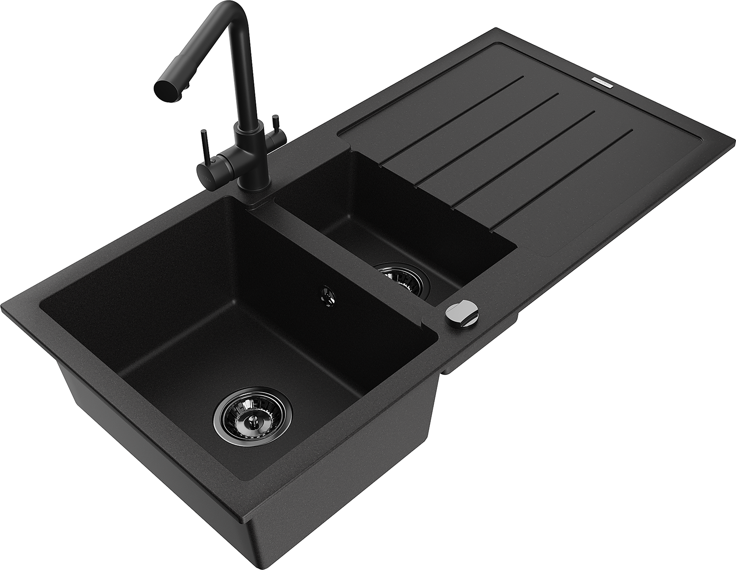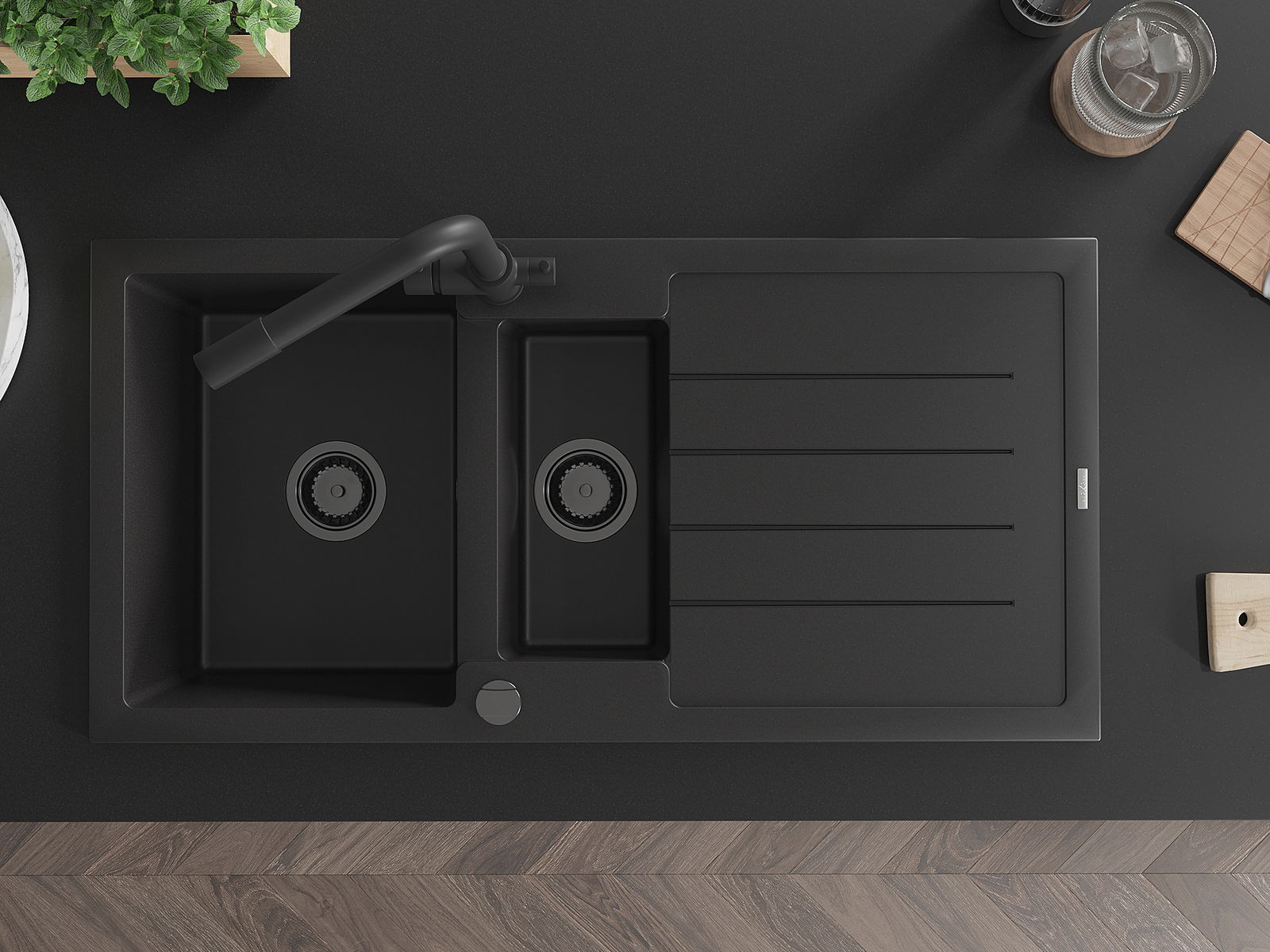 Mexen Andres žulový dřez 1,5-komorový s odkapávačem a kuchyňskou baterií Duero, černý - 6515-77-671600-70-B