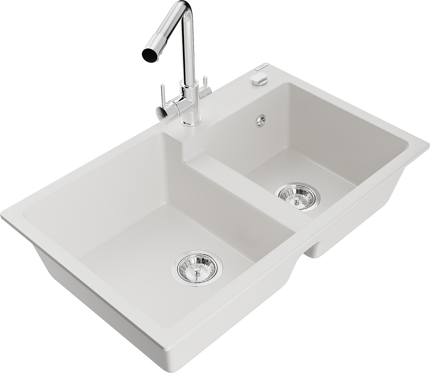 Mexen Tomas žulový dřez s 2 komorami a kuchyňskou baterií Duero, bílý - 6516-20-671600-00