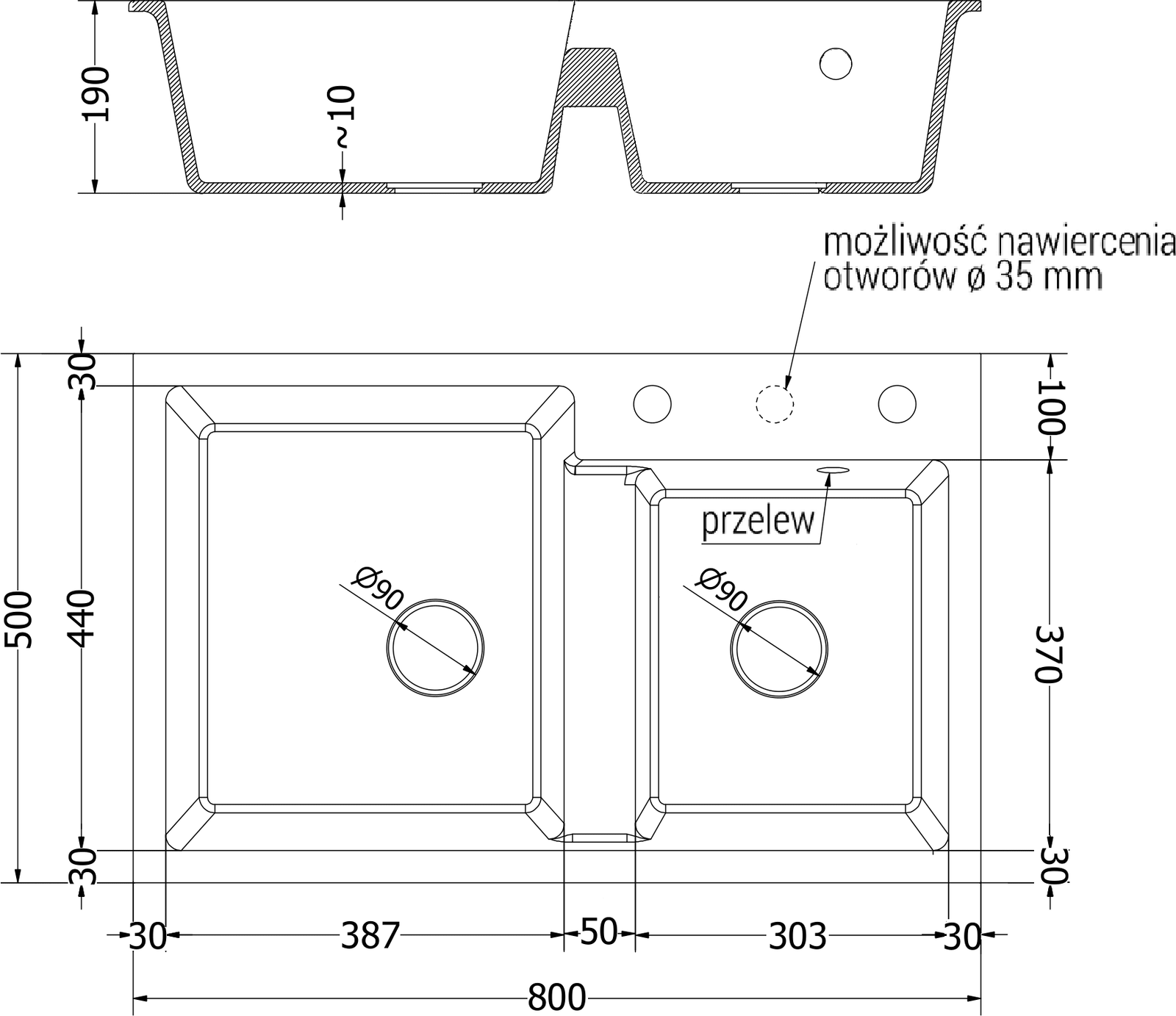 Dřez má předfrézovaný otvor o průměru 35 mm k samostatnému proražení. Může být použit například k montáži dávkovače na tekutinu, který eliminuje přítomnost plastových lahví v kuchyni a dodá jí elegantní finiš.