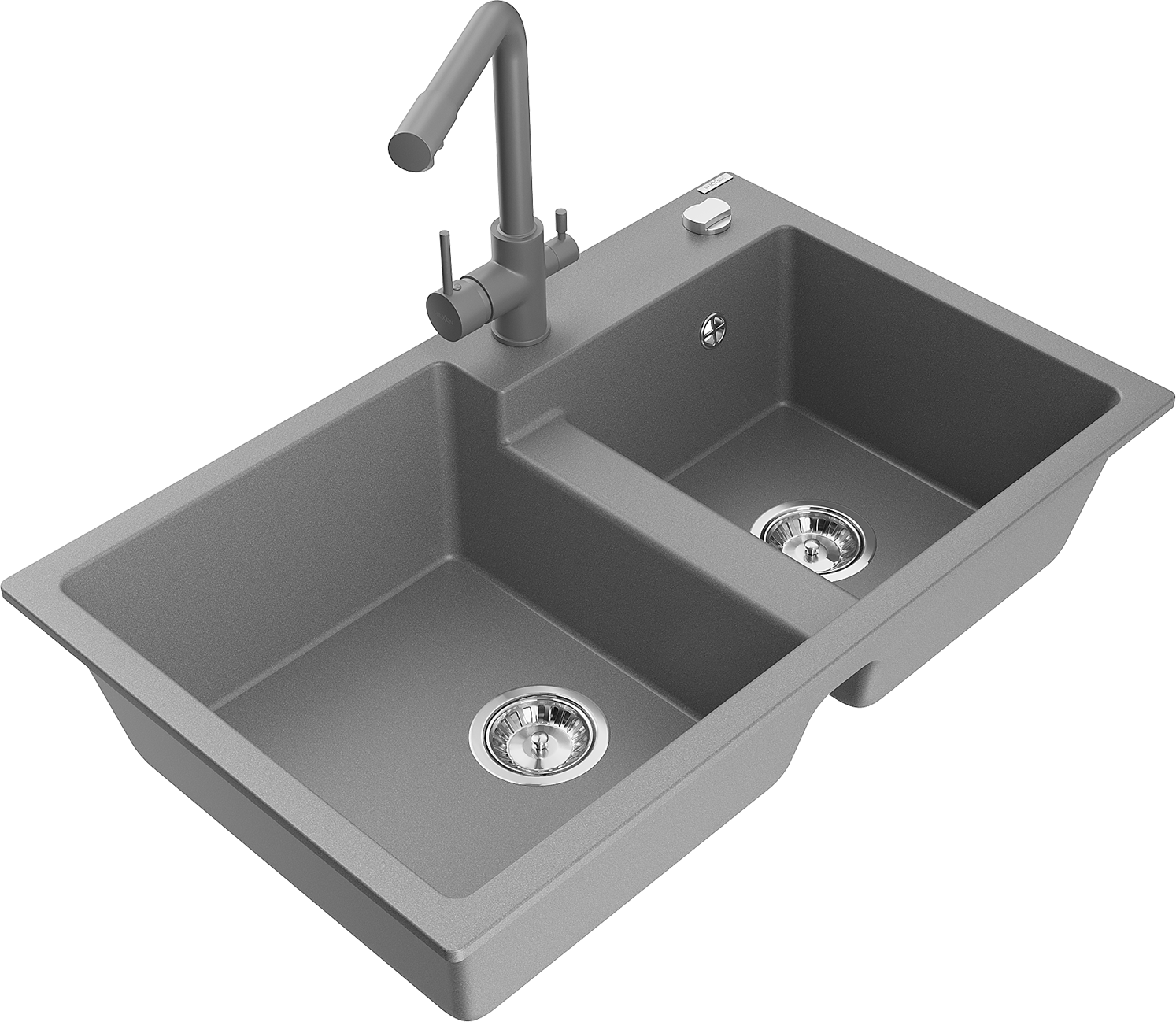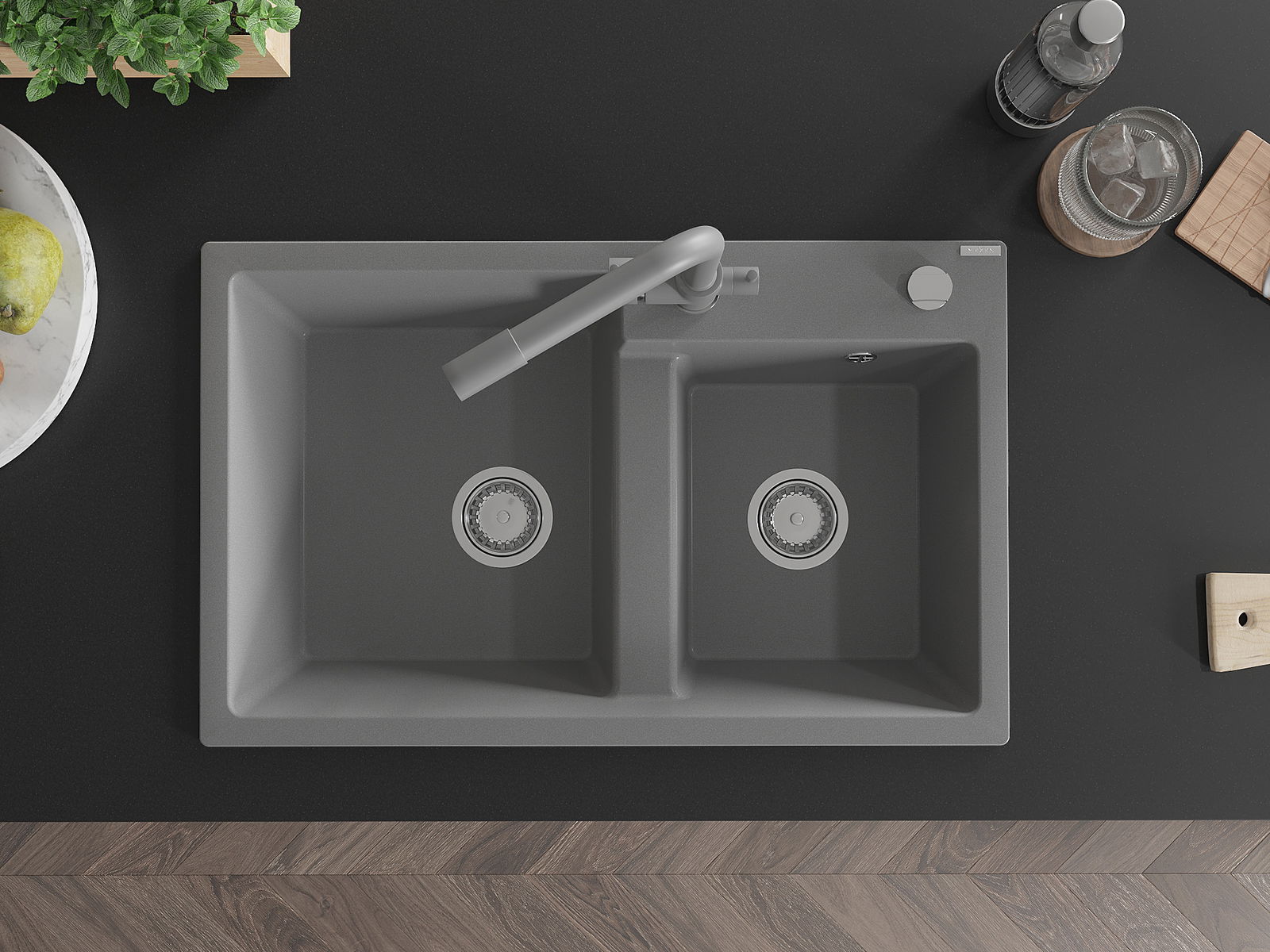 Mexen Tomas žulový dřez s dvoukomorou a kuchyňskou baterií Duero, šedý - 6516-71-671600-71