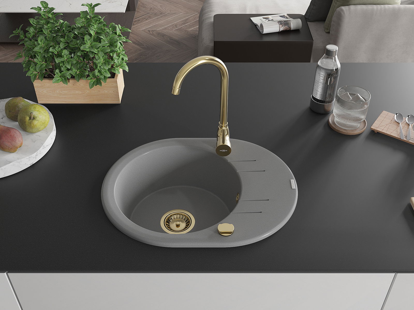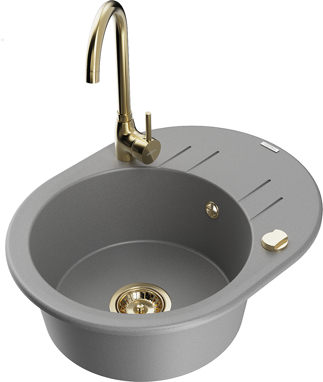 Mexen Kevin granitový dřez 1-komorový s odkapávačem a kuchyňskou baterií Telma, šedý - 6517-71-670200-50