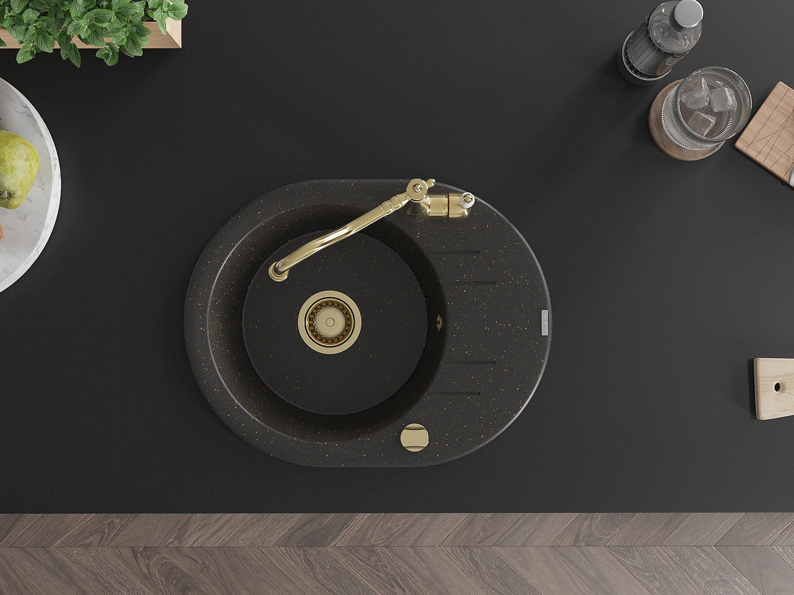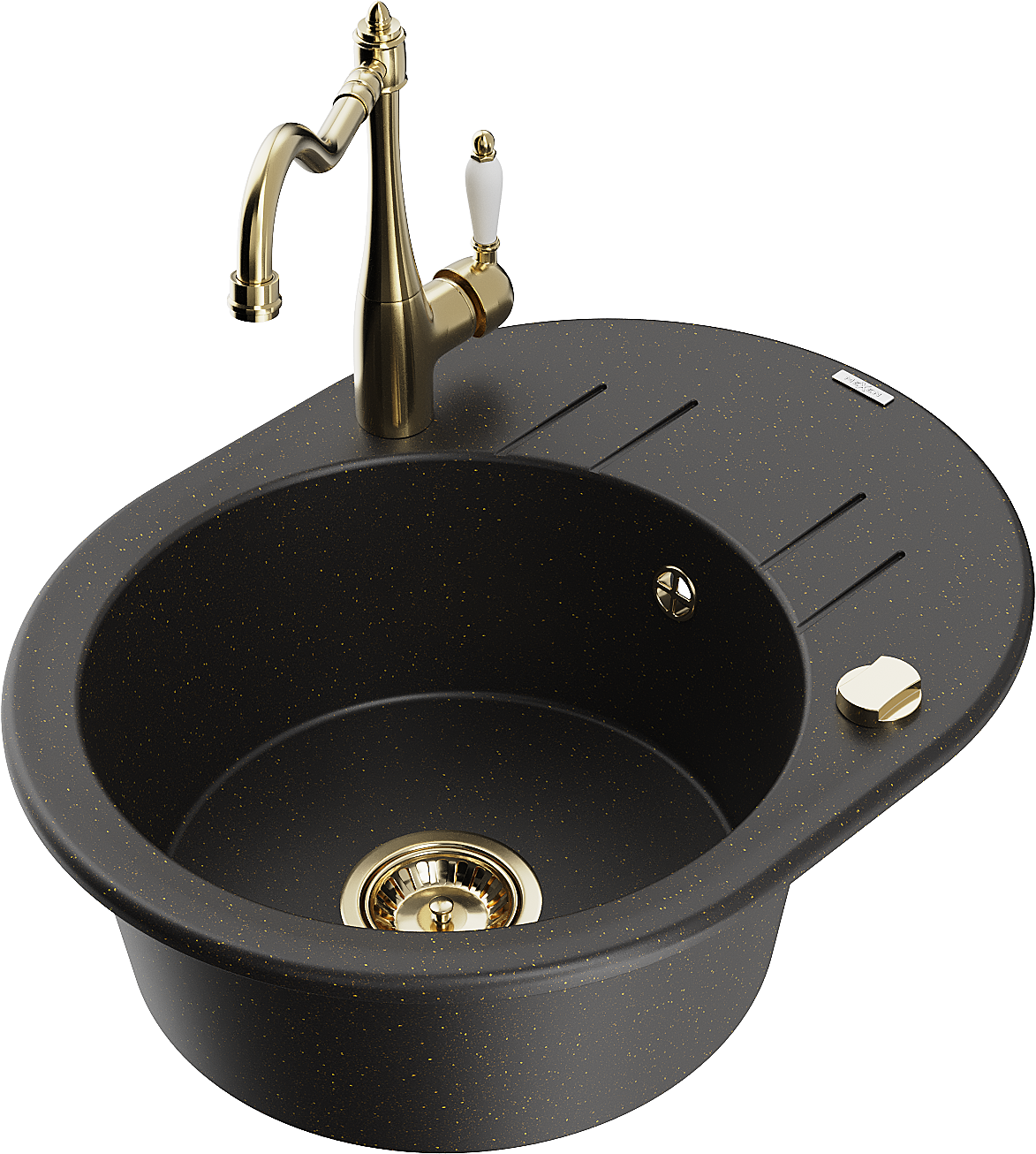 Mexen Kevin granitový dřez 1-komorový s odkapávačem a kuchyňskou baterií Carla, černý/zlatý metalik - 6517-75-670700-50