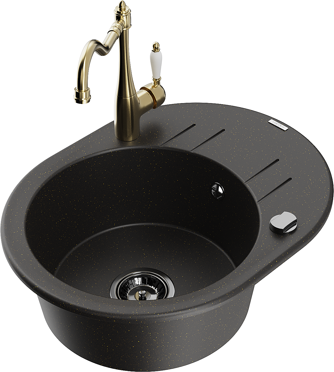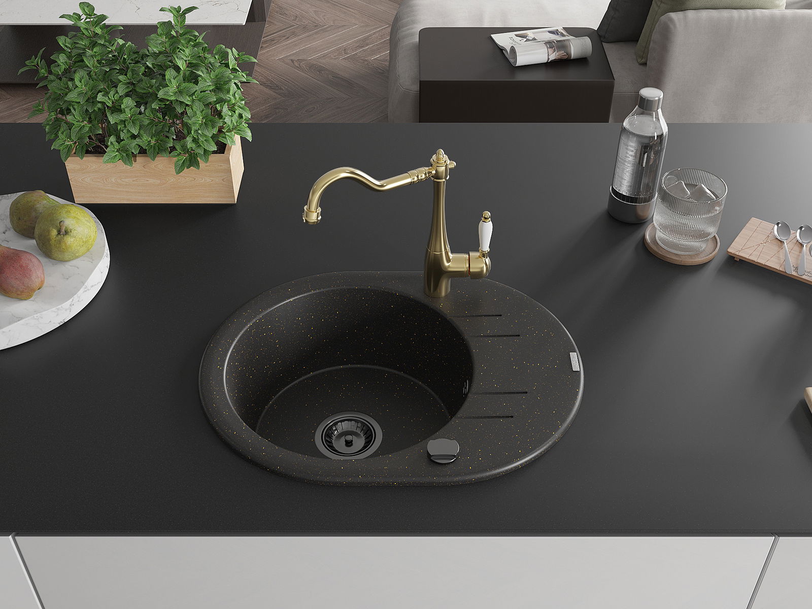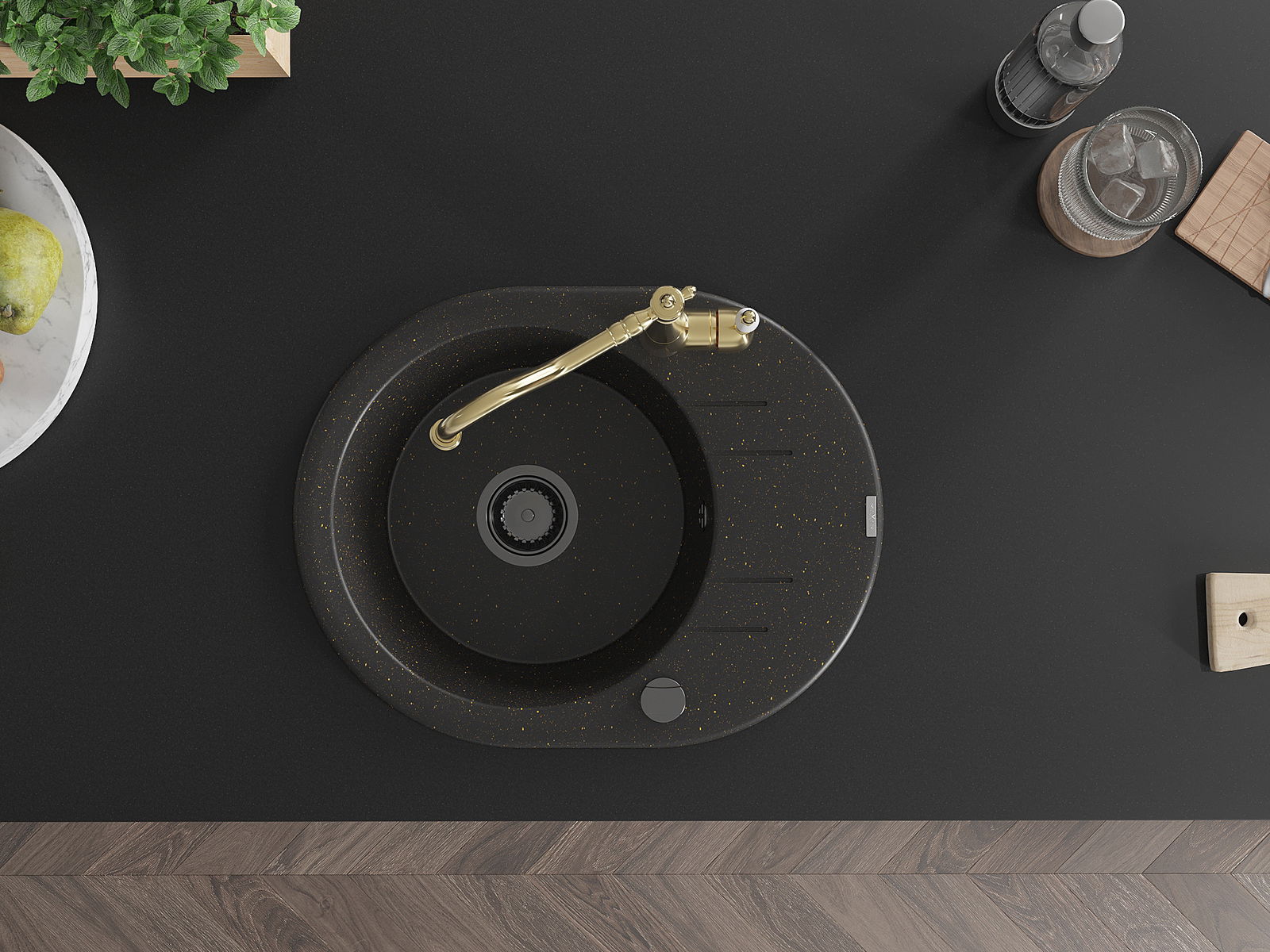 Mexen Kevin granitový dřez s 1 komorou a odkapávačem a kuchyňskou baterií Carla, černý/zlatý metalík