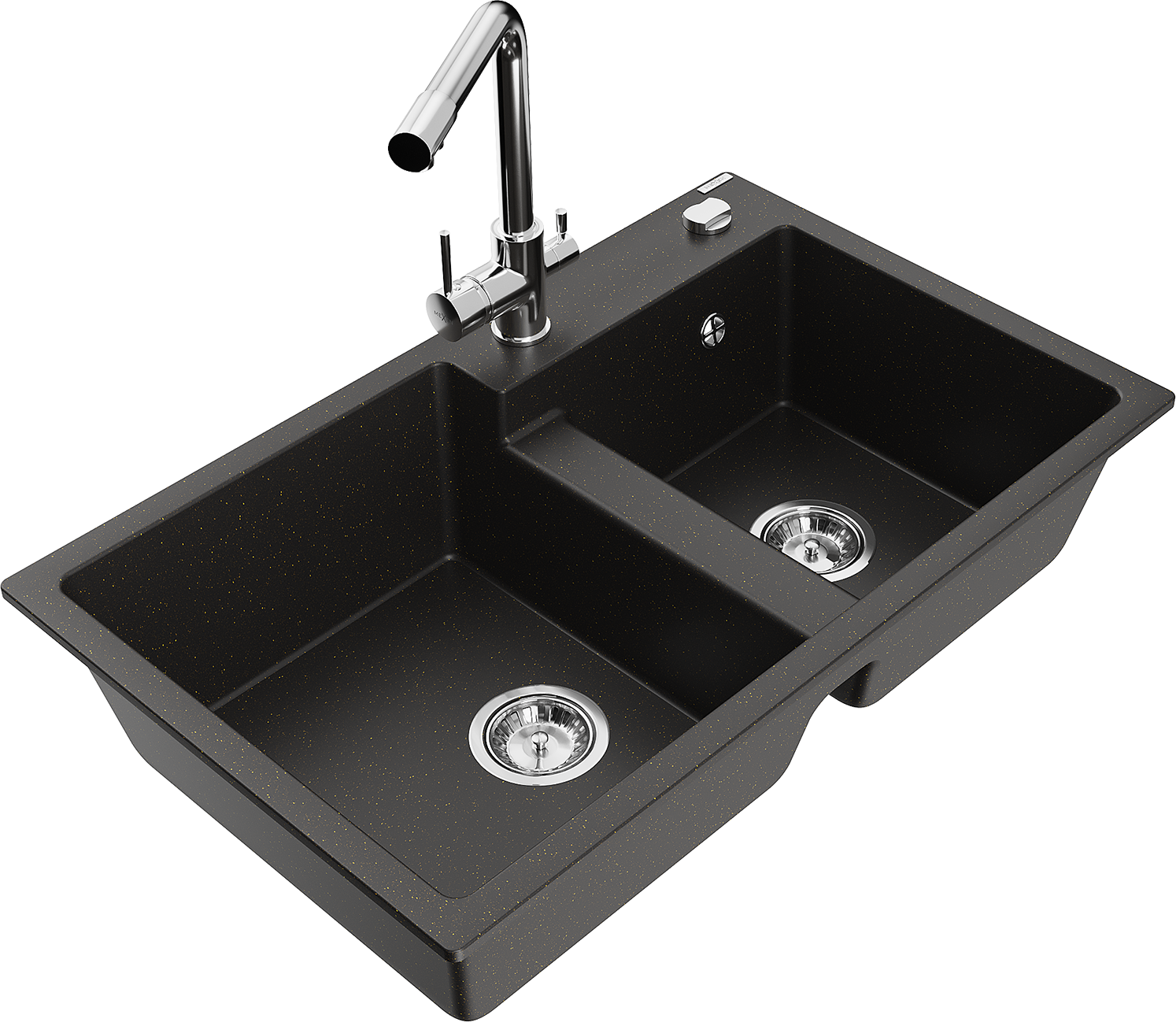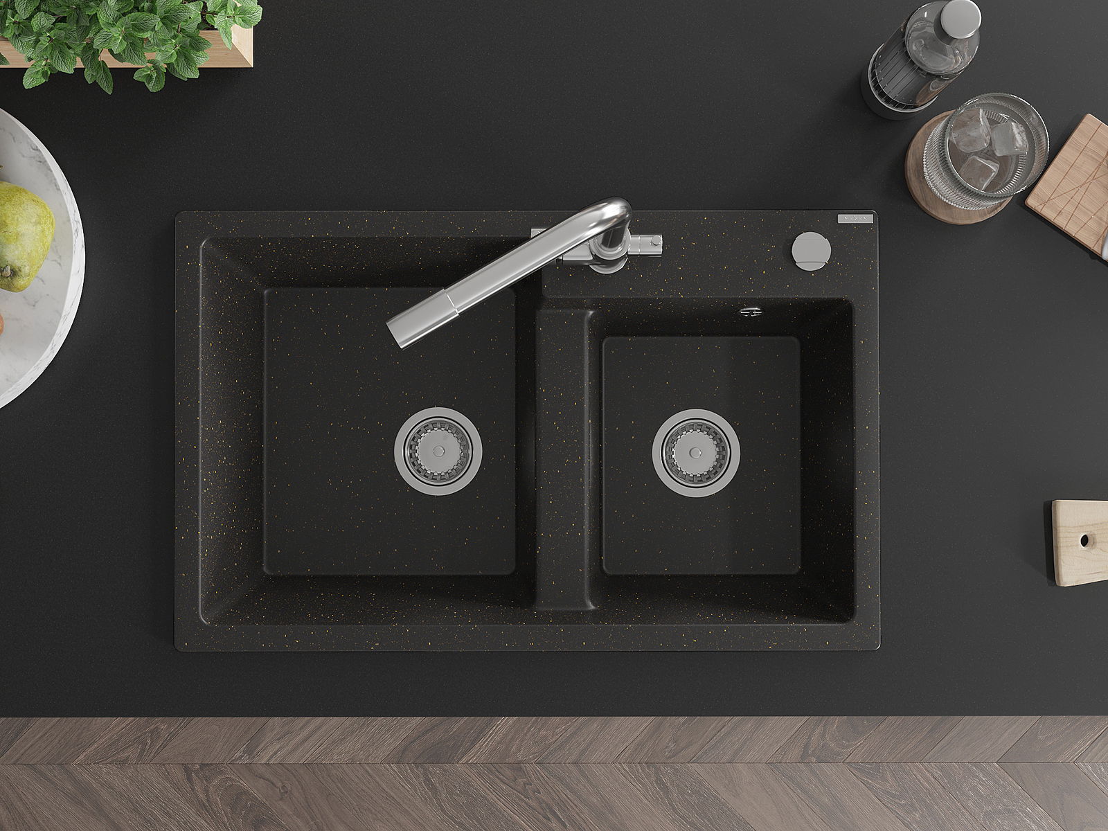 Mexen Tomas dřez granitový 2-komorový s kuchyňskou baterií Duero, černý/zlatý metalik - 6516-75-671600-00