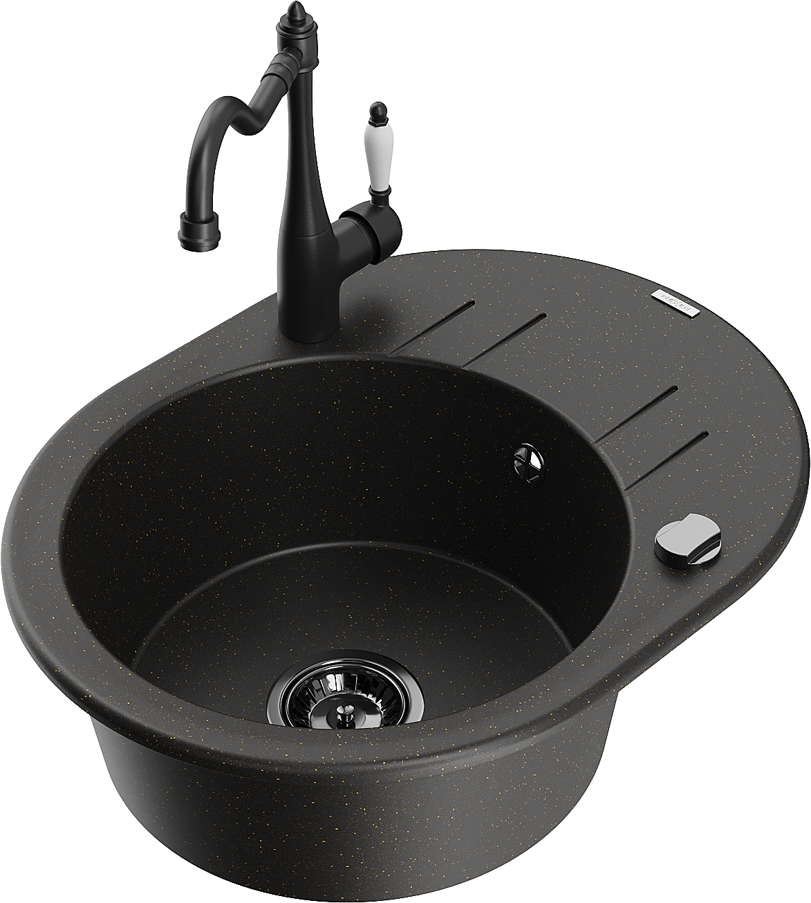 Mexen Kevin granitový dřez 1-komorový s odkapávačem a kuchyňskou baterií Carla, černý/zlatý metalik - 6517-75-670700-70-B