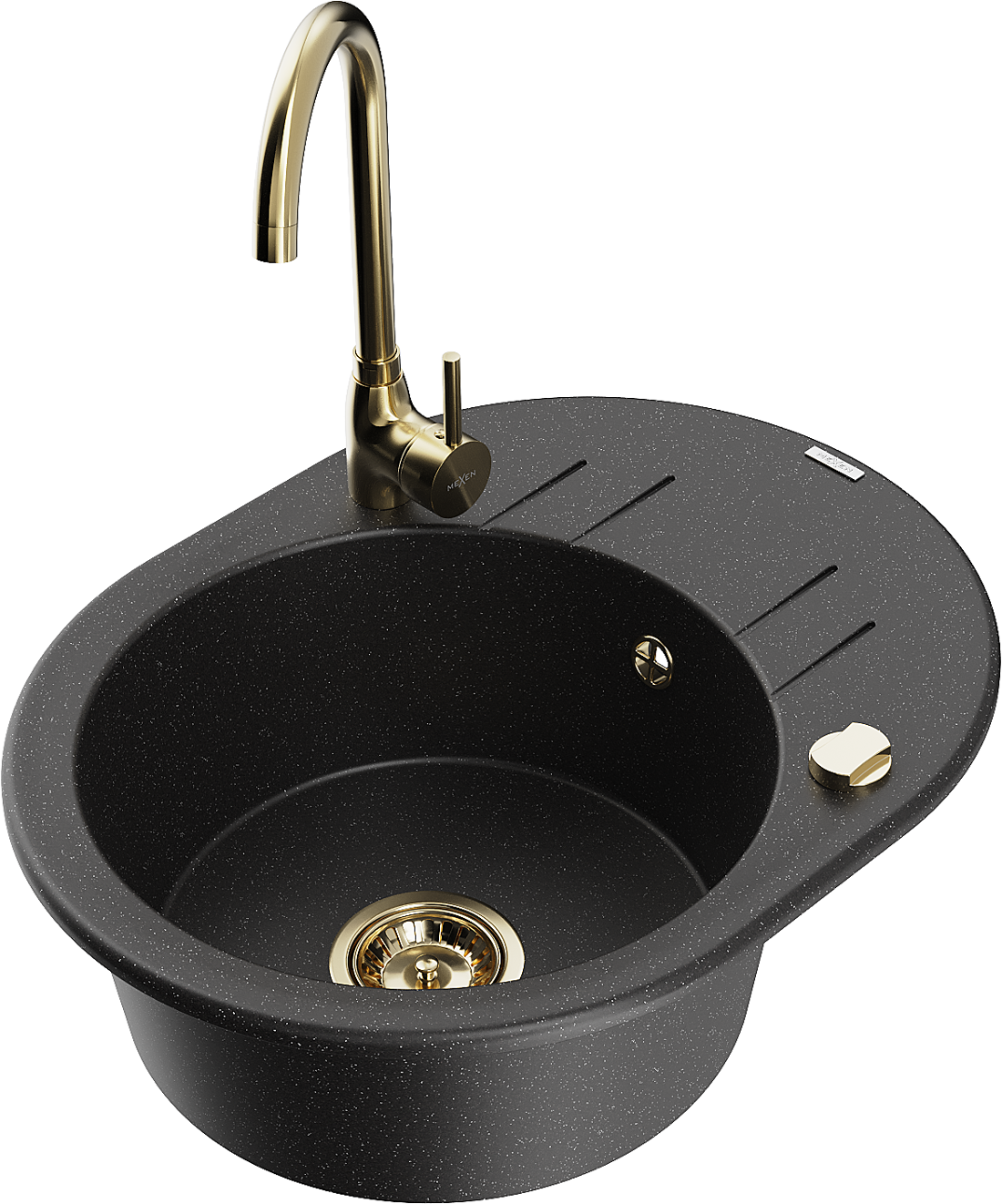 Mexen Kevin granitový dřez 1-komorový s odkapávačem a kuchyňskou baterií Telma, černý/stříbrný metalik - 6517-73-670200-50