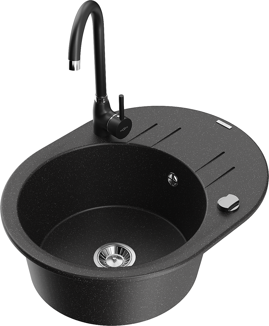 Mexen Kevin granitový dřez 1-komorový s odkapávačem a kuchyňskou baterií Telma, černý/stříbrný metalik - 6517-73-670200-70