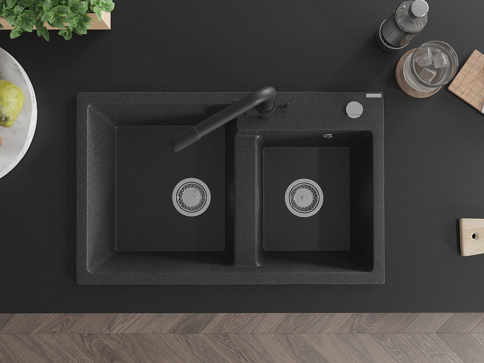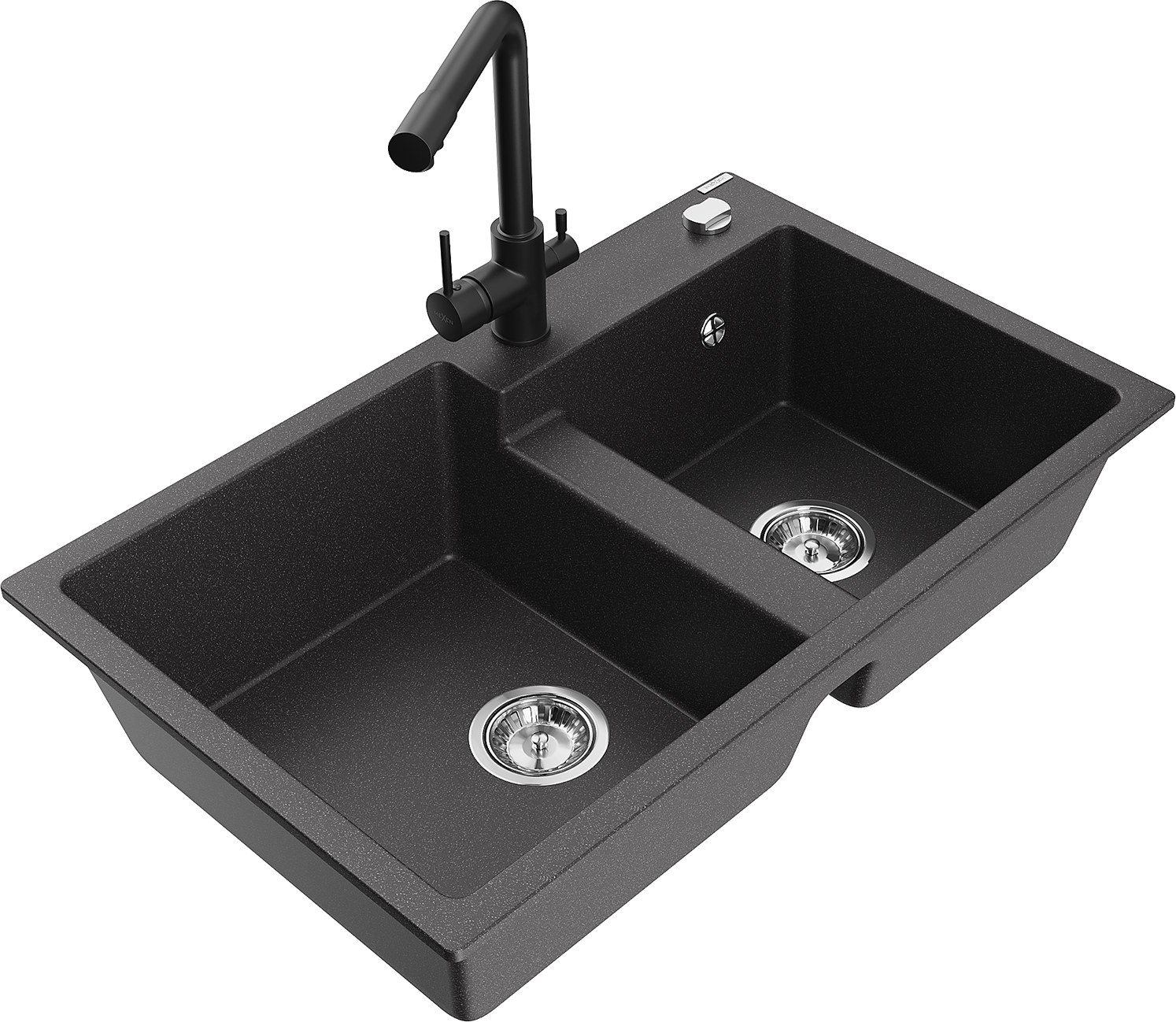 Mexen Tomas dřez žulový 2-komorový s kuchyňskou baterií Duero, černý tečkovaný - 6516-76-671600-70